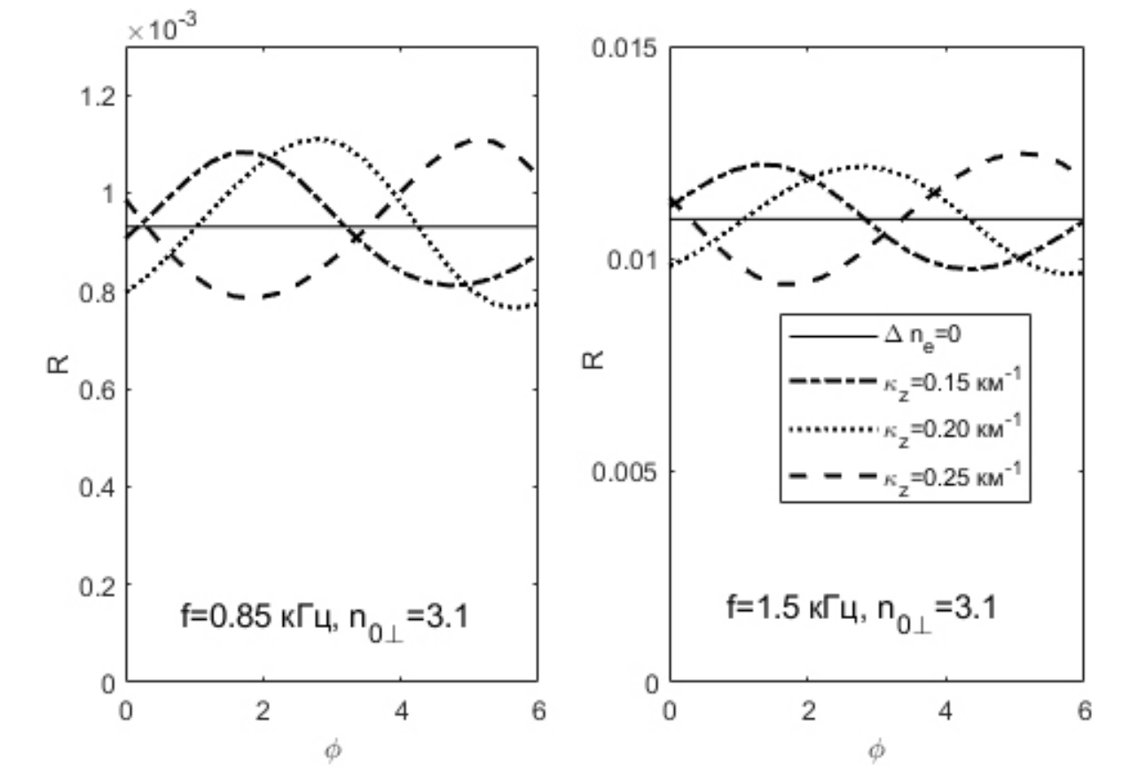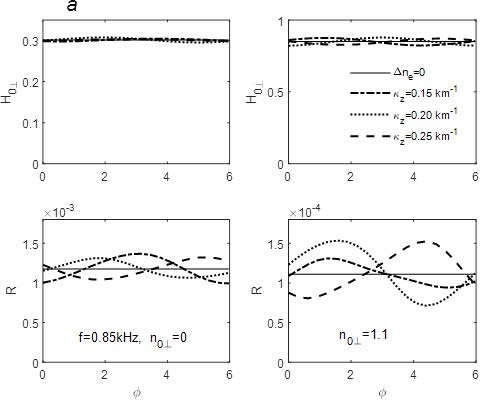 На рис. 4 (для свистовой волны с частотой 0,85 кГц) и 5 (для свистовой волны с частотой 1,5 кГц) изображены зависимости нормализованной амплитуды магнитного поля на земной поверхности (13) (именно эта величина обычно измеряется в наземных обсерваториях) и коэффициента отражения от ионосферы сверху (14) от фазы инфразвуковой волны Графики соответствуют глубине модуляции в инфразвуковой волне и значениям вертикальной длины инфразвуковой волны волны 42 км (1,5), 31 км и 25 км. Графики в левой части рис. 4, 5 соответствуют нормальному падению волны . Графики в правой части рис. 4, 5 приведены для случая что практически соответствует границе «конуса выхода» свистовой волны к земной поверхности. На рис. 6 приведены зависимости коэффициента отражения (14) от фазы для случая наклонного падения с Так как в этом случае волна не достигает земной поверхности, магнитное поле становится на несколько порядков ниже.