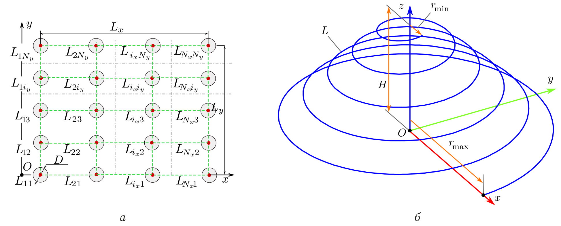Элементы Lix,iy метаструктуры – конические спирали, образованные идеальным проводником, имеющим круглое сечение. Ось каждой спирали спирали параллельна оси Oz. Сам элемент показан на рис. 1, б. Минимальный радиус спирали – rmin, максимальный радиус спирали – rmax. Высота спирали равна H число витков обозначим как Nl. Осью спиральных элементов будем считать линию, совпадающую с осью Oz. Диаметр проводников 2ε существенно меньше λ и существенно меньше размера спиралей и межвиткового расстояния. Это позволяет использовать тонкопроволочное приближение при построении модели метаструктуры (выражения, приведенные в предыдущем разделе).