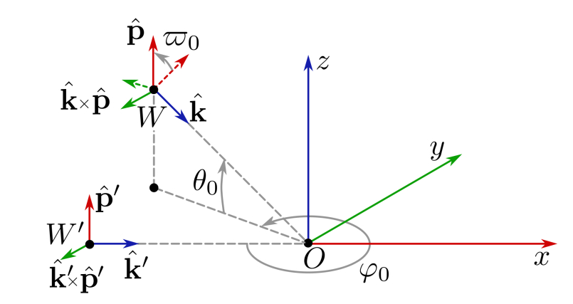 PEMW is defined by five parameters: amplitude phase polarization angle and two angles and that specify the direction of wave propagation. Let us define the base wave (Fig. 2). Its unit vectors coincide with the axes of the global rectangular coordinate system. To avoid ambiguity, we assume that In this way, the wave has a vertical polarization and propagates along the axis The relationship between the unit vectors of the waves and is