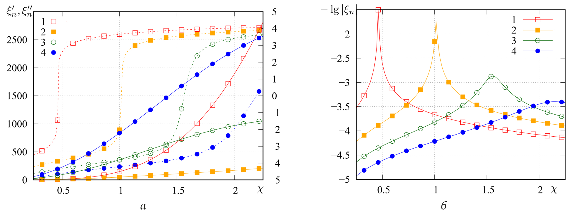 Рис. 3. Зависимость (сплошные кривые, а), (штриховые кривые, а) и (б) от номер маркера (линии) соответствуют номеру собственного значения