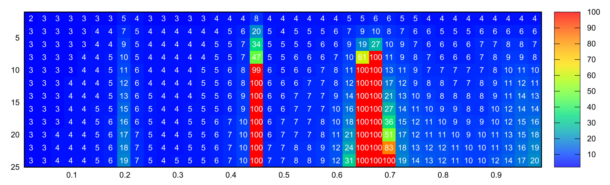Fig. 6. Iterative process convergence table: abscissa axis is ordinate axis is values in cells are number of iterations