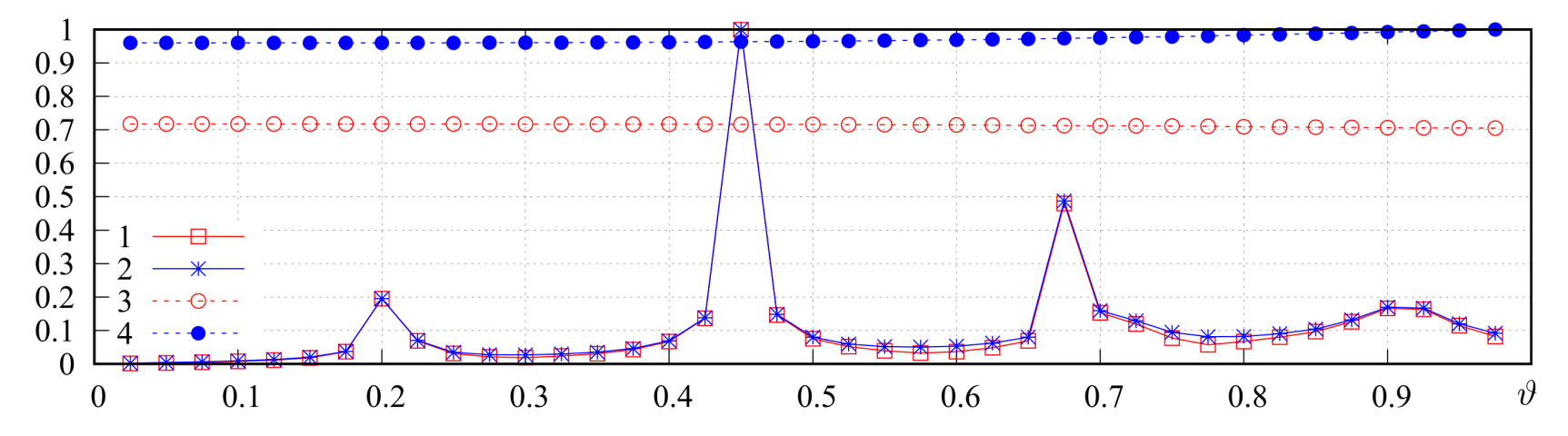 Fig. 8. Dependencies (curve 1), (curve 2), (curve 3), and (curve 4) vs.
