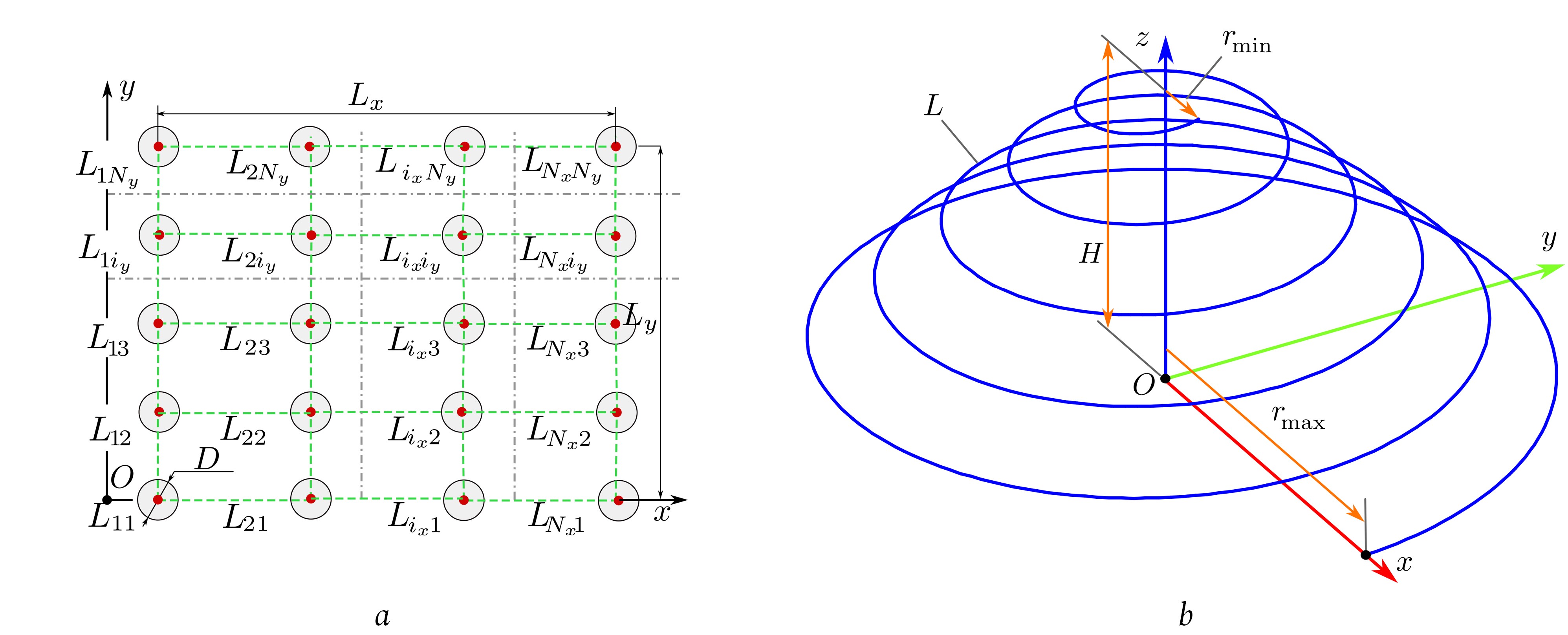 Let us consider the geometry of the array. Hereinafter, and are the distances between neighboring elements. With these notations, we can find the coordinates of the array nodes: