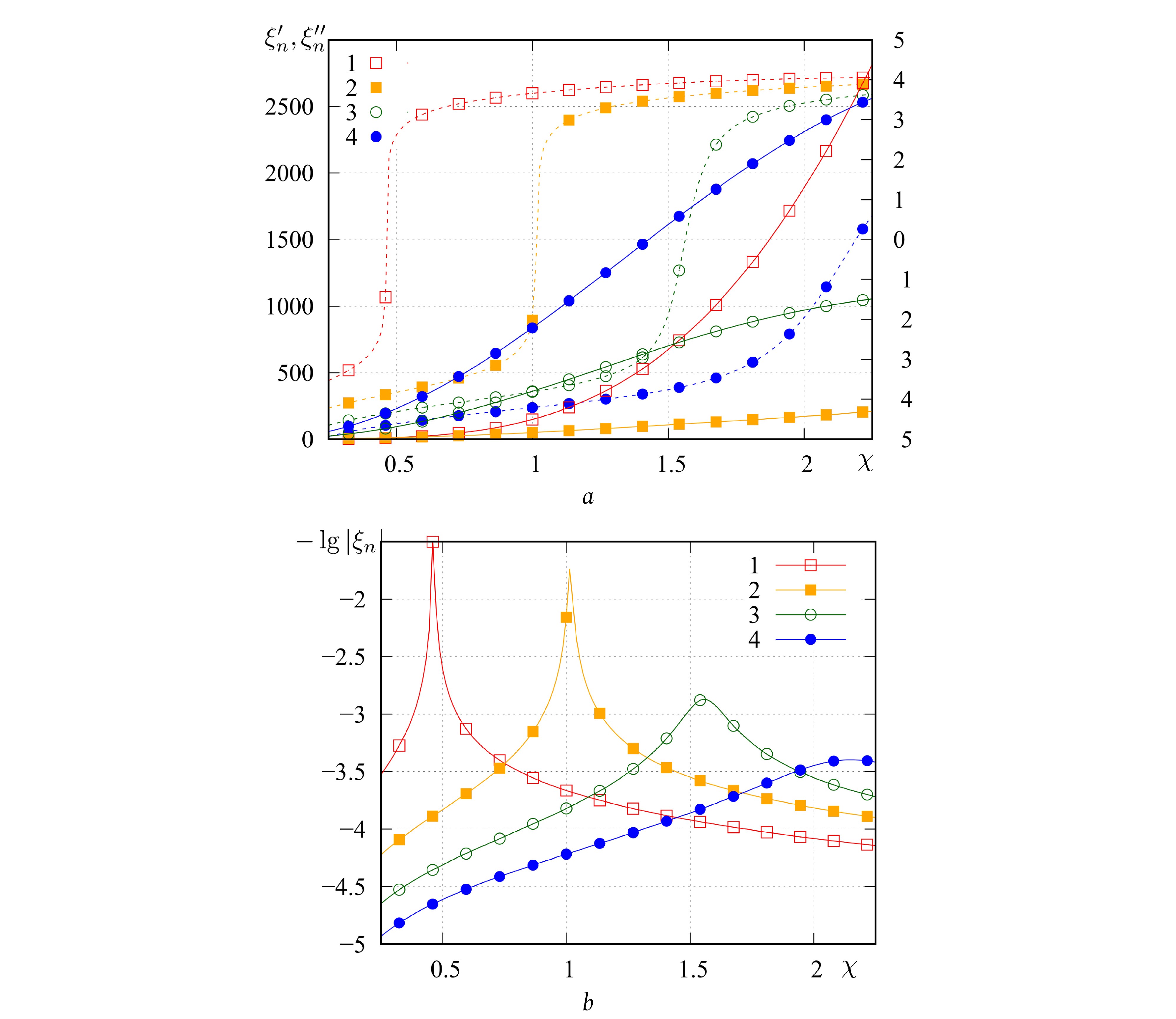 Fig. 3. Dependence (solid curves, a), (dashed curves, a) and (b) vs. The curve number is the EV number