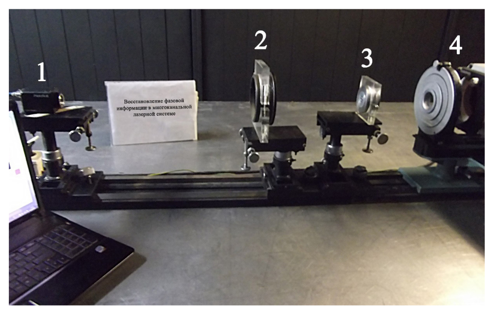 A physical experiment to restore phase information was carried out on a model of a seven-channel laser system with a uniform intensity distribution and a different phase shift in each channel. The general view of the laboratory bench is shown in Fig. 2.
