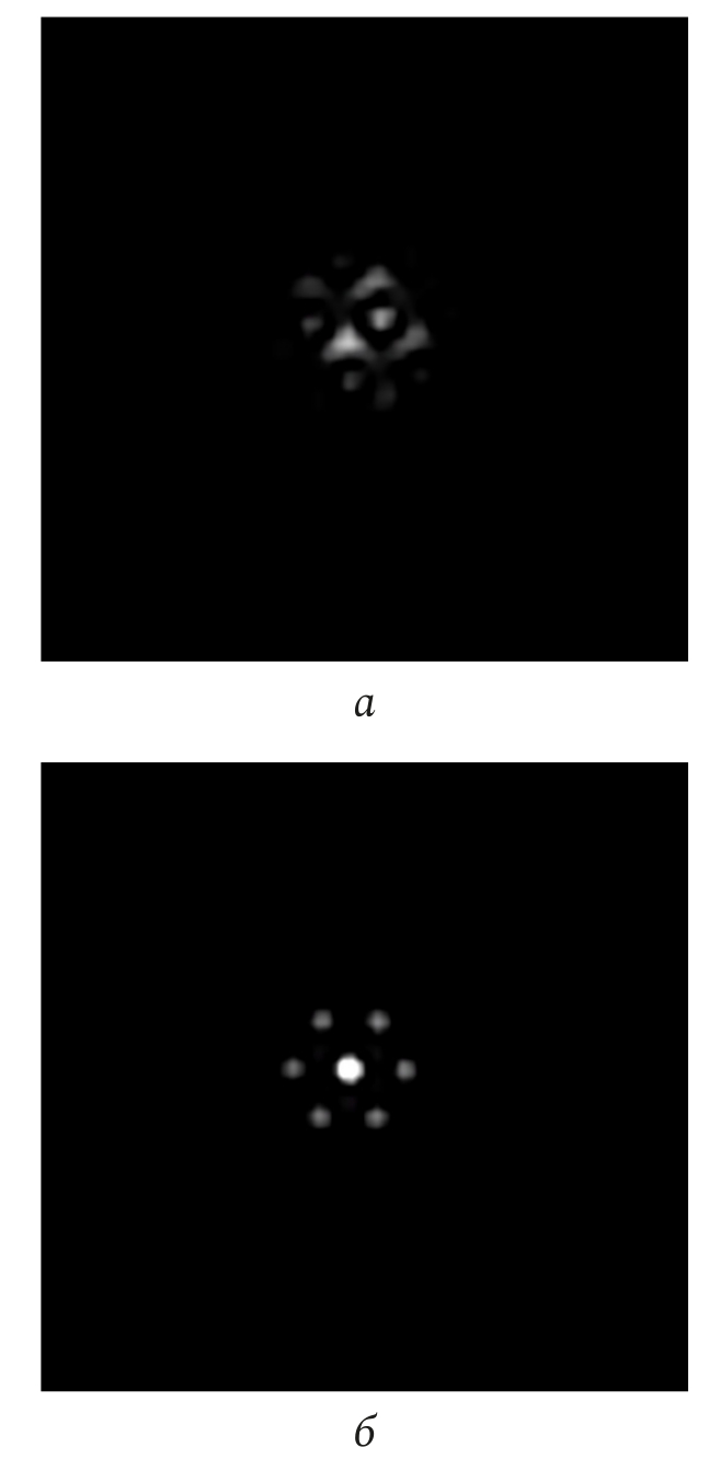 where SPH is the sharpness function of the phased system (with equal phases in each channel). The analysis for a 7-channel laser system was performed in [8]. We demonstrated that with a centrally symmetric initial modulus, the convergence of the algorithm is not guaranteed and depends on the initial conditions. The problem of collateral side solutions can be solved by introducing antisymmetric amplitude modulation. In this case, an amplitude mask is placed in the system, whose transmission coefficient is a specially chosen two-dimensional function that has no central symmetry. The implementation of this constraint provides guaranteed convergence of the algorithm for the 7-laser system.