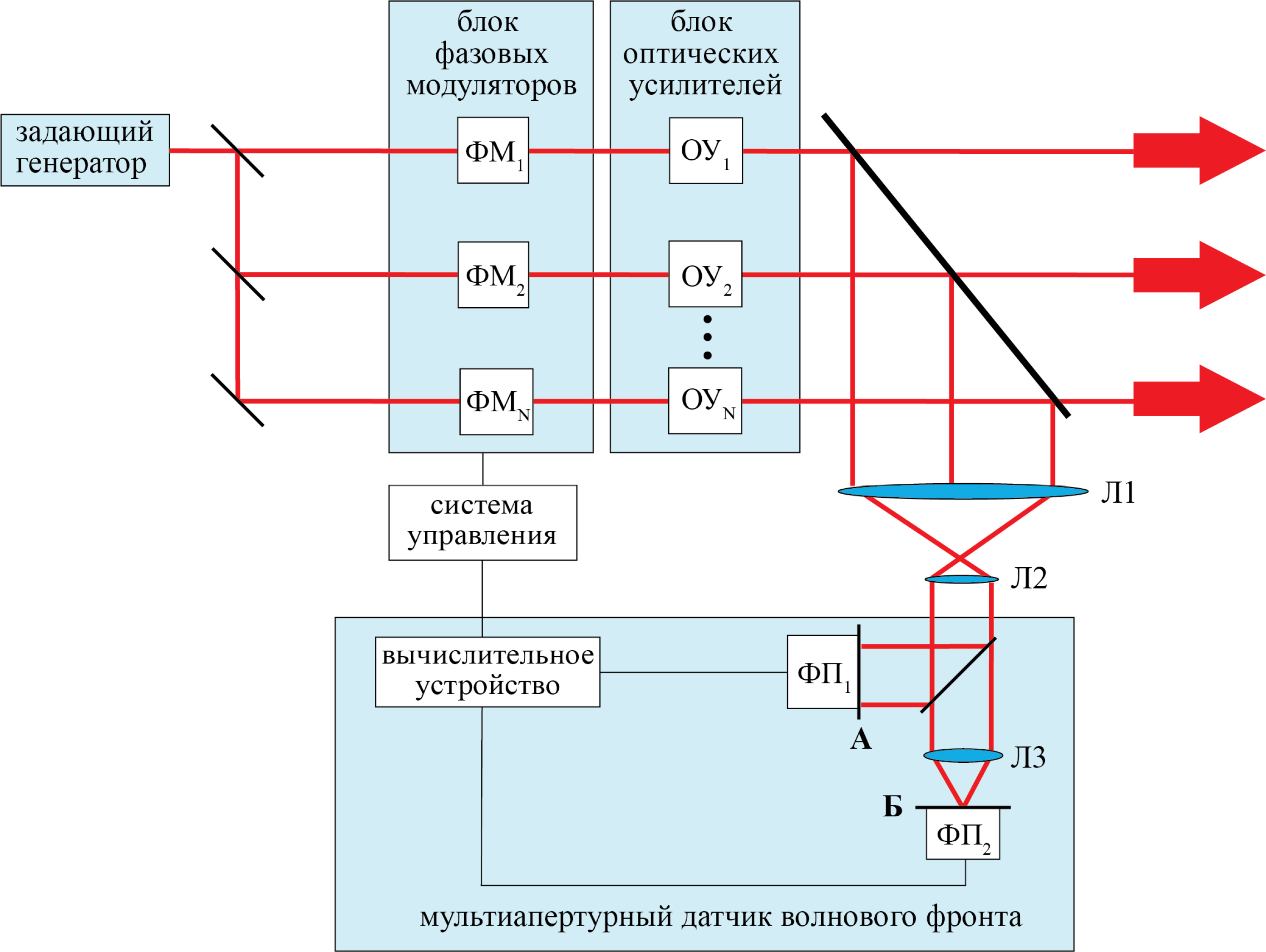The optical signal from a single reference oscillator is divided into N laser beams. After passing through a block of phase modulators and single-mode optical amplifiers, the radiation is split into two beams. The phase at the output of each amplifier is random due to the different optical paths in the individual laser channels. The main beam hits the output aperture and the second beam is focused on the photodetector, which registers the image at the aperture and focal image planes. The measured distributions are fed to the computing device, where in the course of implementation of the iterative algorithm the phase distribution is determined, on the basis of which control signals to the phase modulators for synchronization of the laser channels are formed.