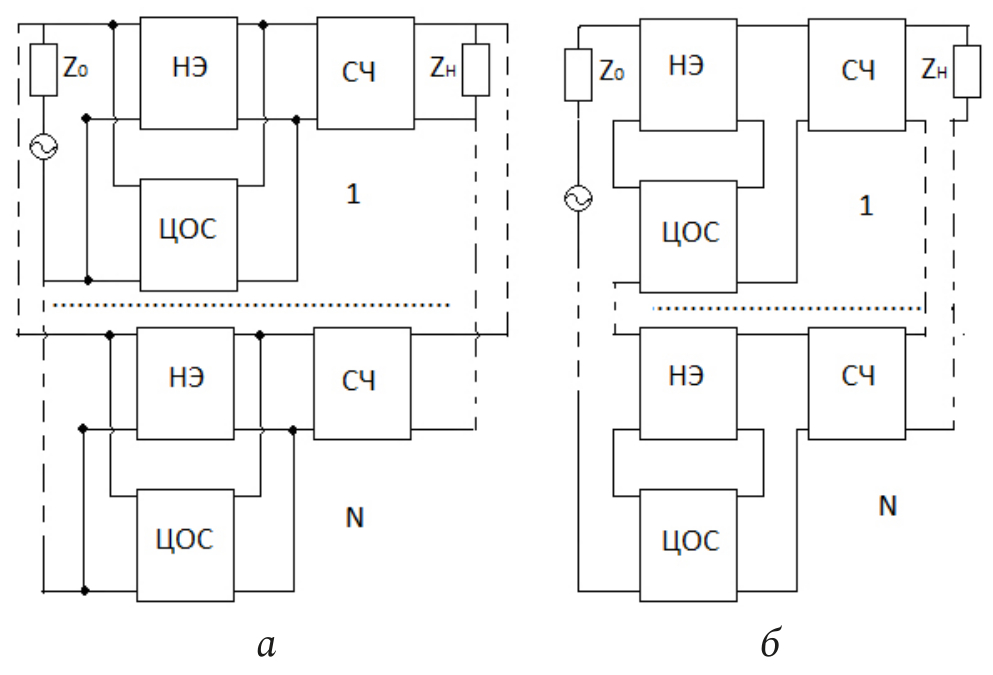 Рис. 1. Структурные схемы многокаскадных радиоустройств с параллельной по напряжению (а) и последовательной по току (б) ЦОС, включенными между источником сигнала и СЧ