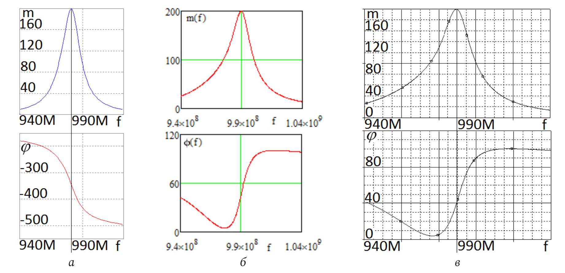 Рис. 13. Частотные характеристики (АЧХ и ФЧХ) принципиальной схемы (рис. 11), полученные в системе MicroCap (а) и характеристики (АЧХ и ФЧХ) эквивалентной схемы (рис. 12), полученные в системе MathCad (б) и OrCad (в)