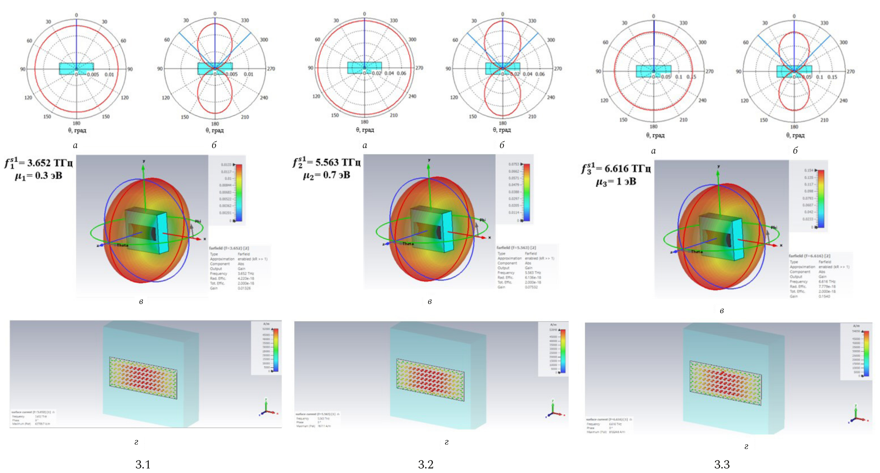 Рис. 3. ДН плазмонной антенны на основе прямоугольной графеновой наноленты на диэлектрической подложке на резонансных частотах основной моды ППП при s-поляризации возбуждающей TEM-волны и сканирование по частоте в ТГц–диапазоне при изменении значения химического потенциала 2D ДН в E-плоскости (в зависимости от (а), в E-плоскости (в зависимости от (б) в полярной (а, б) и 3D ДН в сферической (в) системах координат и распределение вектора плотности поверхностного электрического тока на графеновой наноленте (г); 3.1 – ТГц, 3.2 – ТГц, эВ; 3.3 – ТГц, 1 эВ; интенсивность излучения и плотности поверхностного электрического тока обозначены цветом в электронной версии статьи