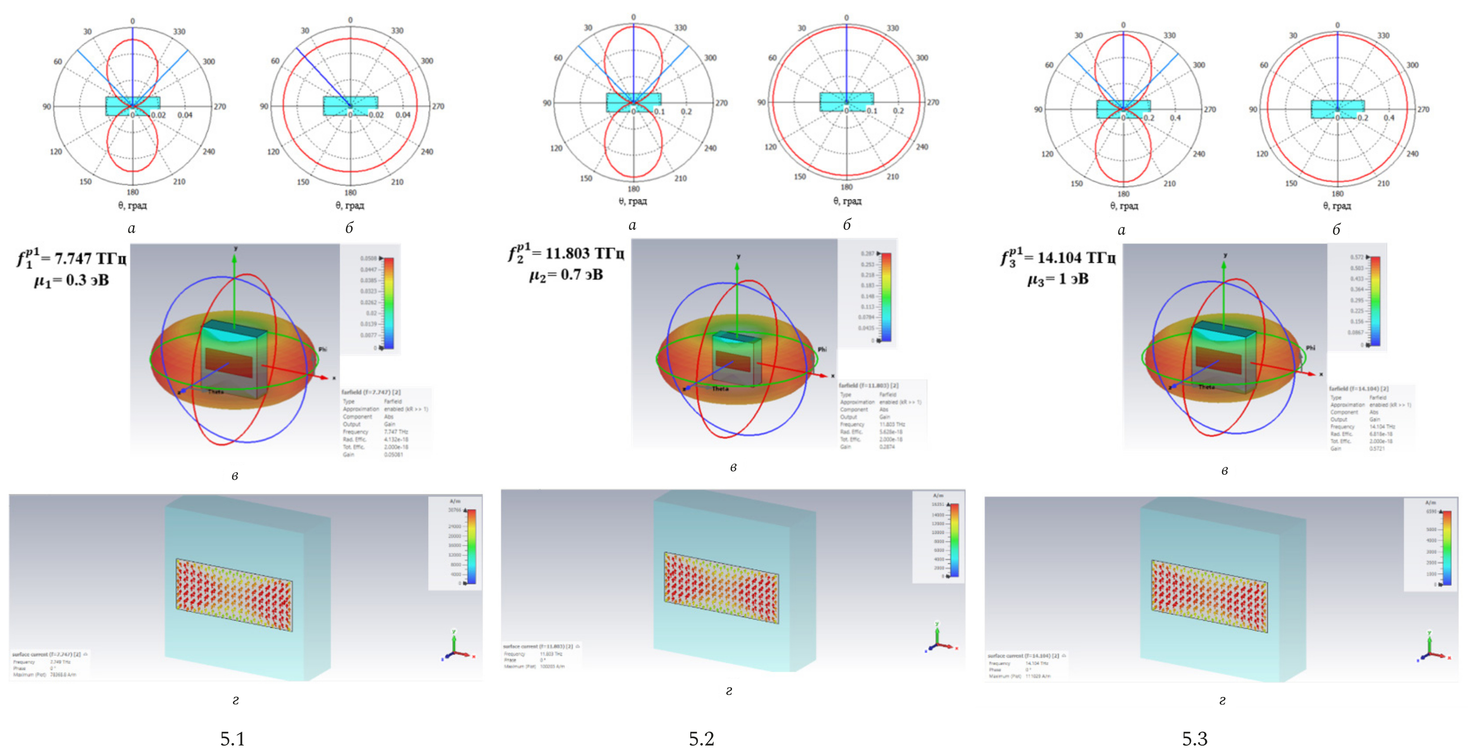 Рис. 5. ДН плазмонной антенны на основе прямоугольной графеновой наноленты на диэлектрической подложке на резонансных частотах основной моды ППП при p-поляризации возбуждающей TEM-волны и сканирование по частоте в ТГц, дальнем и среднем ИК-диапазонах при изменении значения химического потенциала 2D ДН в E-плоскости (в зависимости от (а), в E-плоскости (в зависимости от (б) в полярной (а, б) и 3D ДН в сферической (в) системах координат и распределение вектора плотности поверхностного электрического тока на прямоугольной графеновой наноленте (г); 5.1 – 7,747 ТГц, 0,3; 5.2 – 11,803 ТГц, 0,7 эВ; 5.3 – 14,104 ТГц, 1 эВ; интенсивность излучения и плотности поверхностного электрического тока обозначены цветом в электронной версии журнала