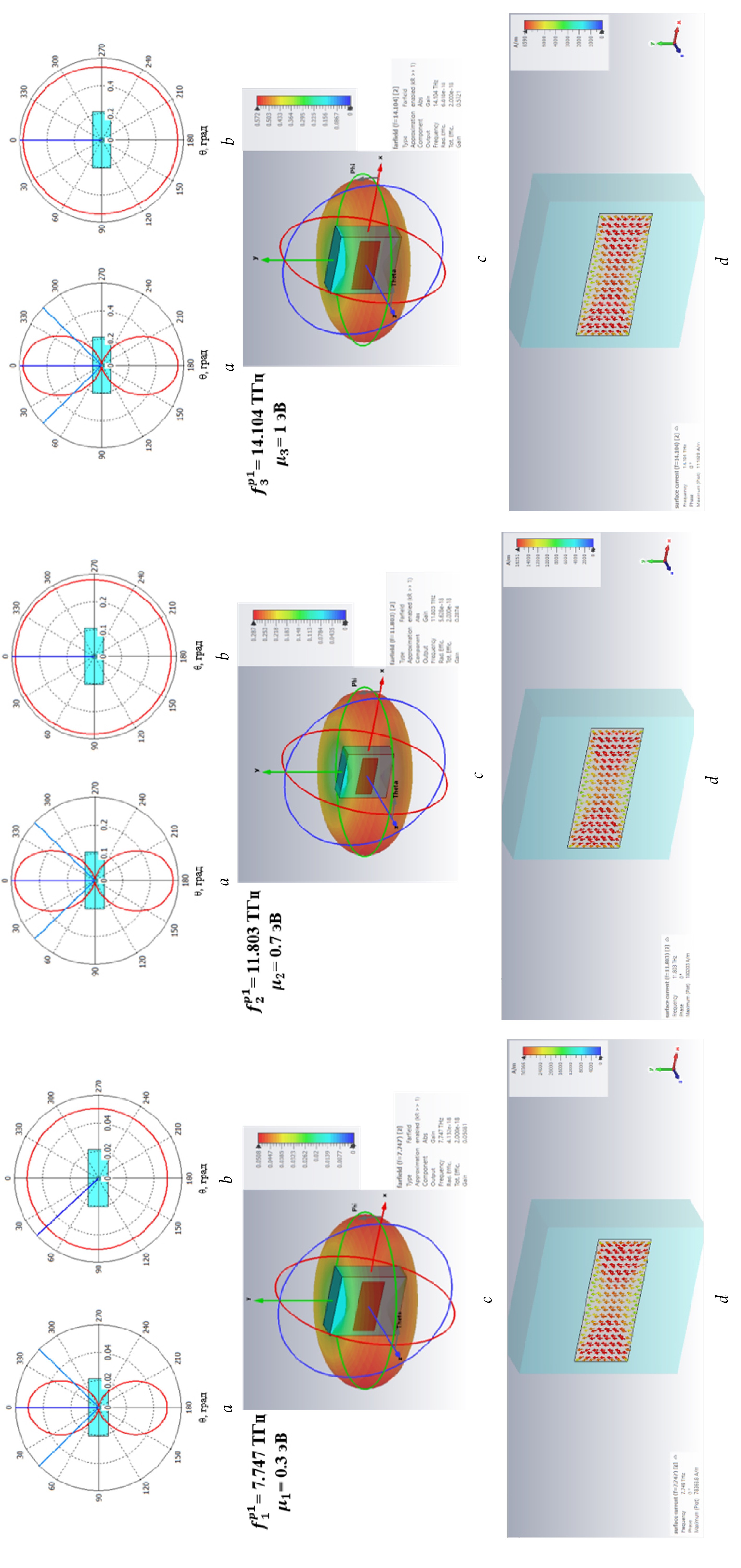 Fig. 3 illustrates the simulation results from CST MWS 2023. We modeled the directivity pattern (DP) of a plasmonic graphene antenna on a dielectric substrate and examined the distribution of the surface electric current density vector on the graphene nanoribbon at the resonant frequencies associated with the main SPP mode. This occurs when the antenna is excited by an s-polarized TEM wave, considering different chemical potentials of 0,3, 0,7, 1 eV.