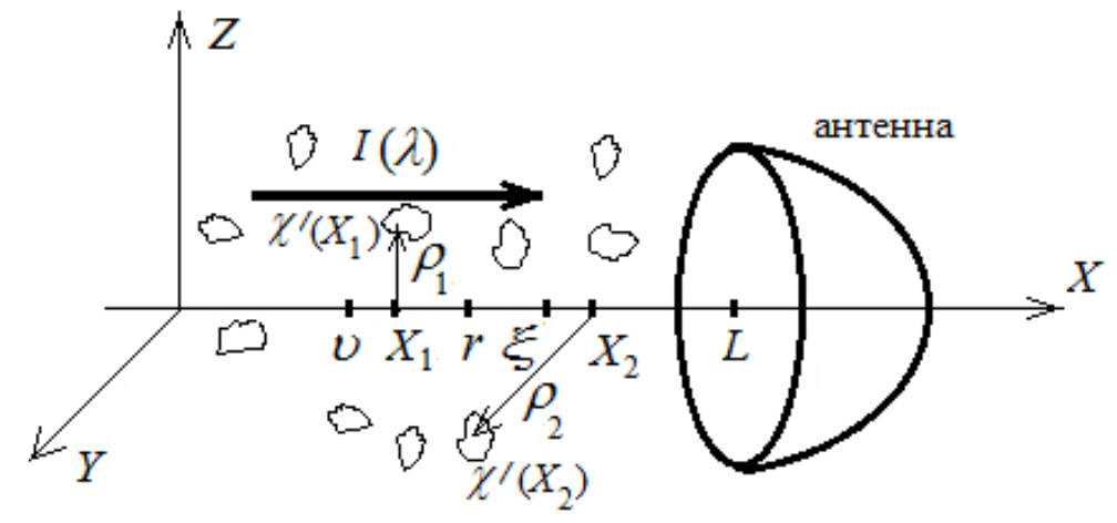 где – волновой вектор флуктуаций эйконала электромагнитной волны за счет турбулентности, и – радиусы векторы с началом в точках и на оси Х в плоскостях модули которых вычисляются по формулам рис. 1, – двухточечный Фурье-спектр флуктуаций эйконала радиосигнала.