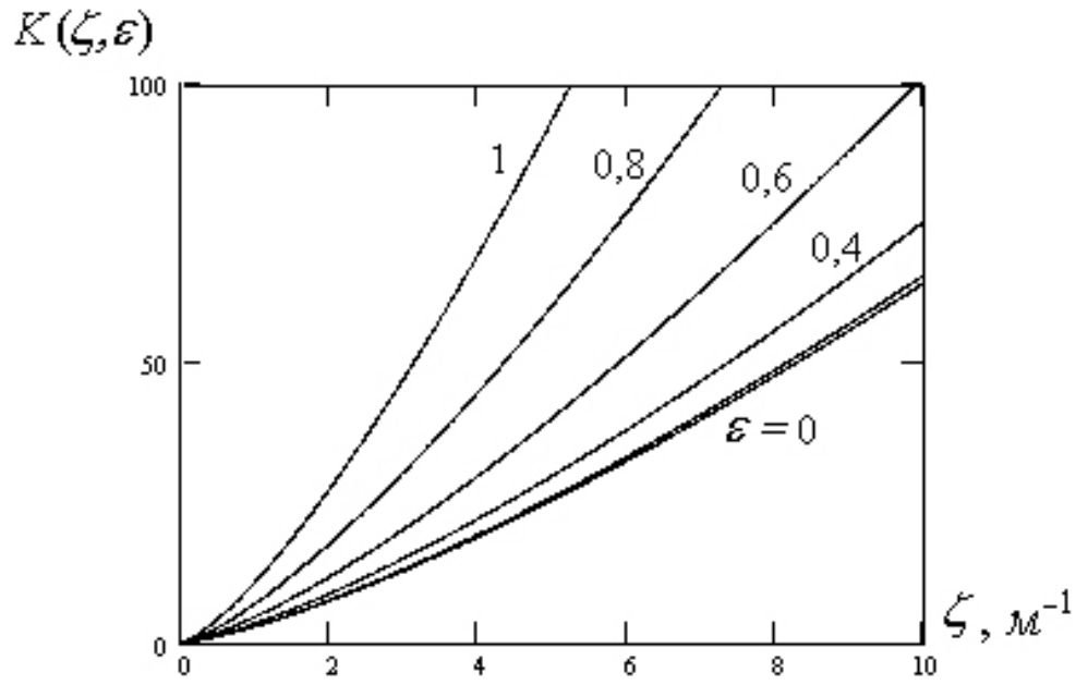 Как следует из рис. 2, параметр среднего квадрата флуктуаций интегральной интенсивности радиосигнала растет с увеличением волнового числа турбулентных пульсаций При этом, чем больше относительное смещение длины волны радиосигнала тем круче рост При малых величина флуктуаций интегральной интенсивности радиосигнала практически не зависит от смещения спектральных длин волн радиосигнала за счет турбулентности.