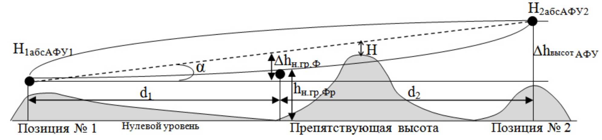 Указанные на рис. 2 обозначения характеризуют следующие параметры: hн. гр. Фр – высота нижней границы существенной зоны распространения радиосигнала (первой зоны Френеля), которая отсекает часть препятствия, Н1,2абсАФУ – высоты мачт соответствующих антенно-фидерных устройств, – величина смещения нижней границы зоны вниз или вверх.
