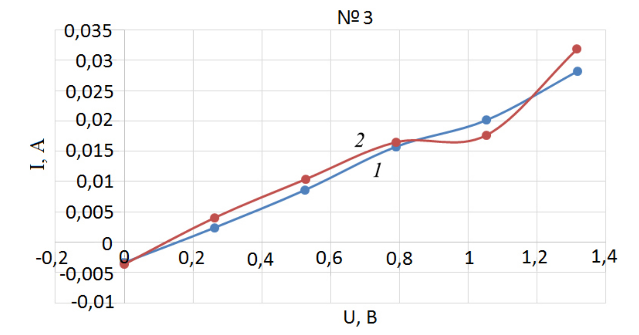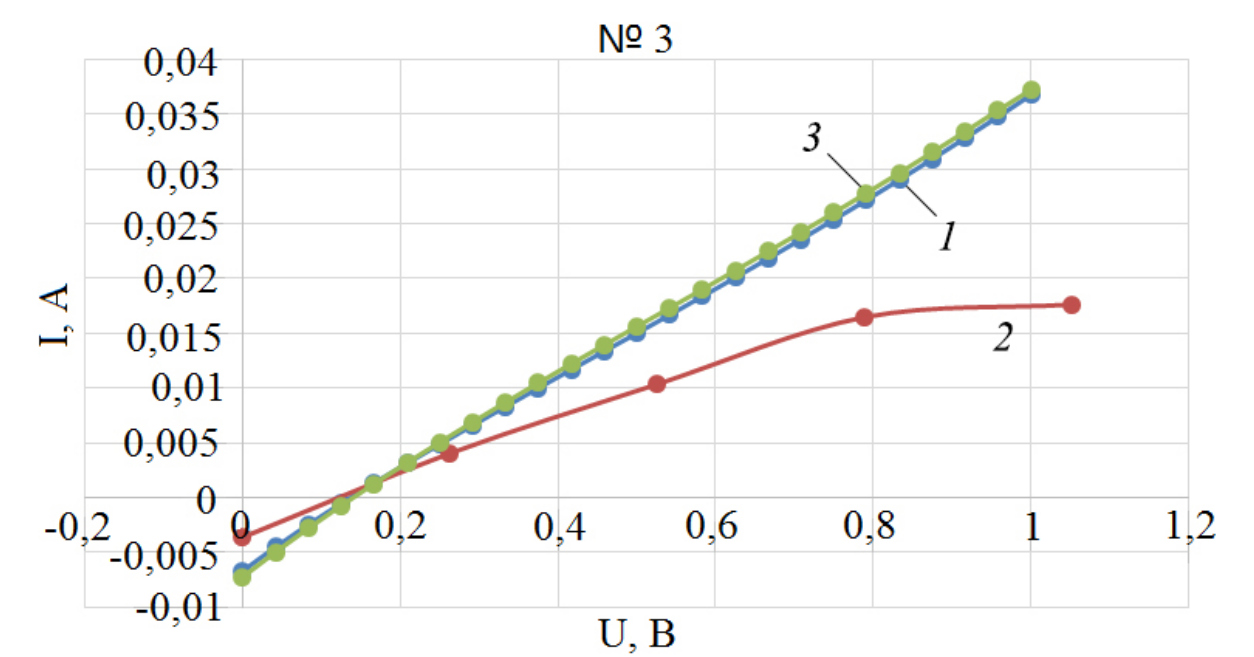 Из графиков видно, что нанесение квантовых точек поспособствовало повышению значений тока у всех образцов. Снижение значения тока образца № 3, соответствующее значению 1,13 В, можно объяснить сбоем измерительного оборудования, что подтверждается дальнейшими исследованиями.