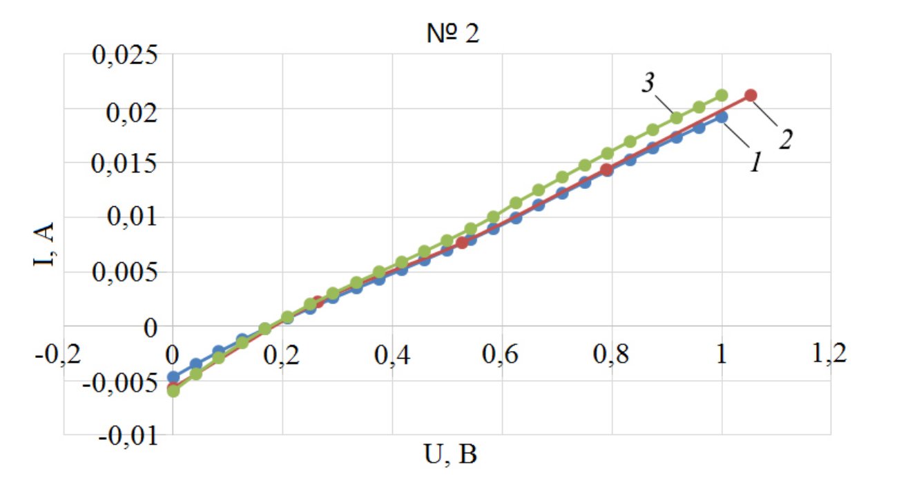 Рис. 6. ВАХ образца № 2 через день после первого нанесения квантовых точек (1), сразу после первого нанесения квантовых точек (2) и сразу после второго нанесения квантовых точек (3)