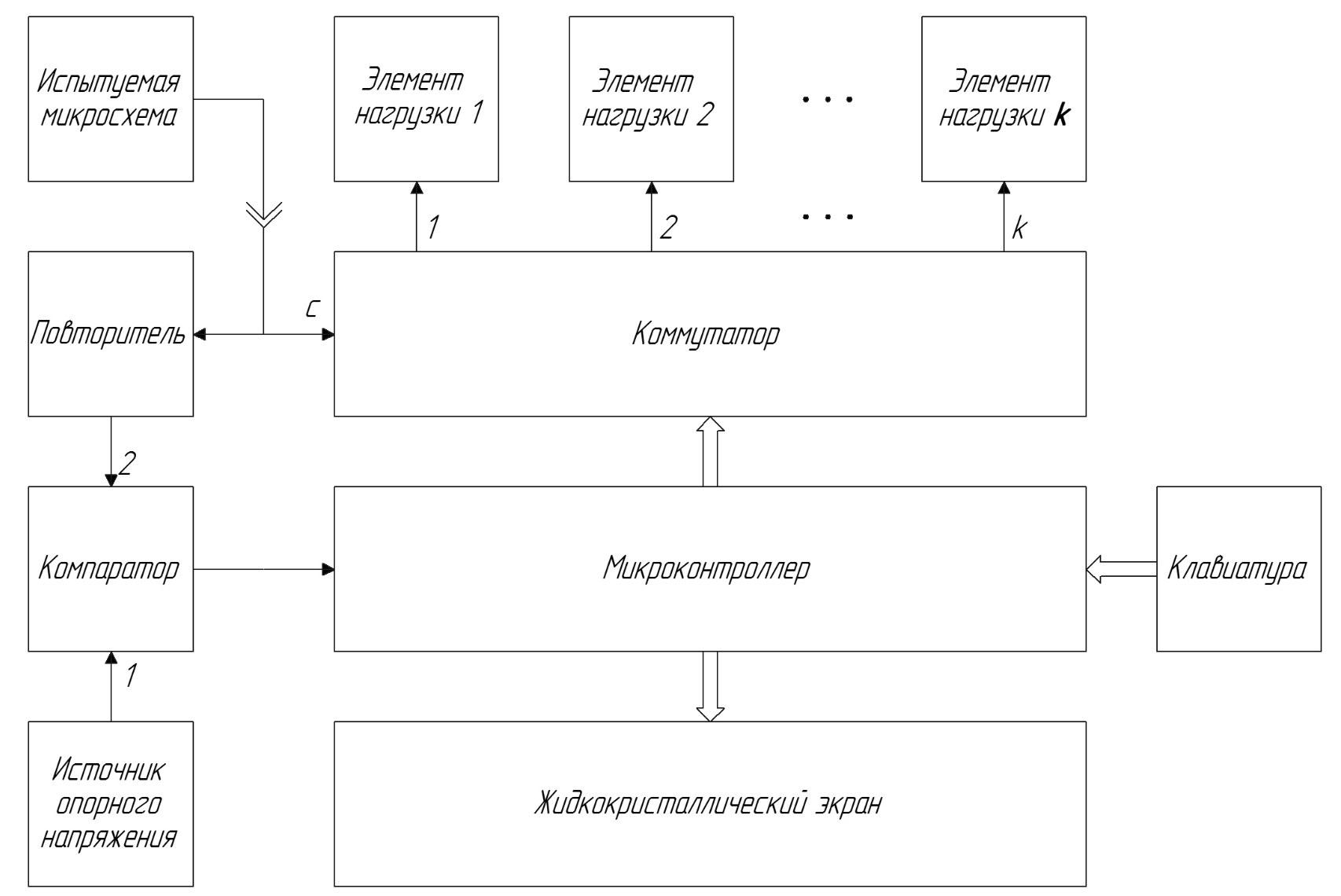 Устройство содержит испытуемую микросхему, повторитель, компаратор, источник опорного напряжения, элементы нагрузки, коммутатор, микроконтроллер, жидкокристаллический экран и клавиатуру.