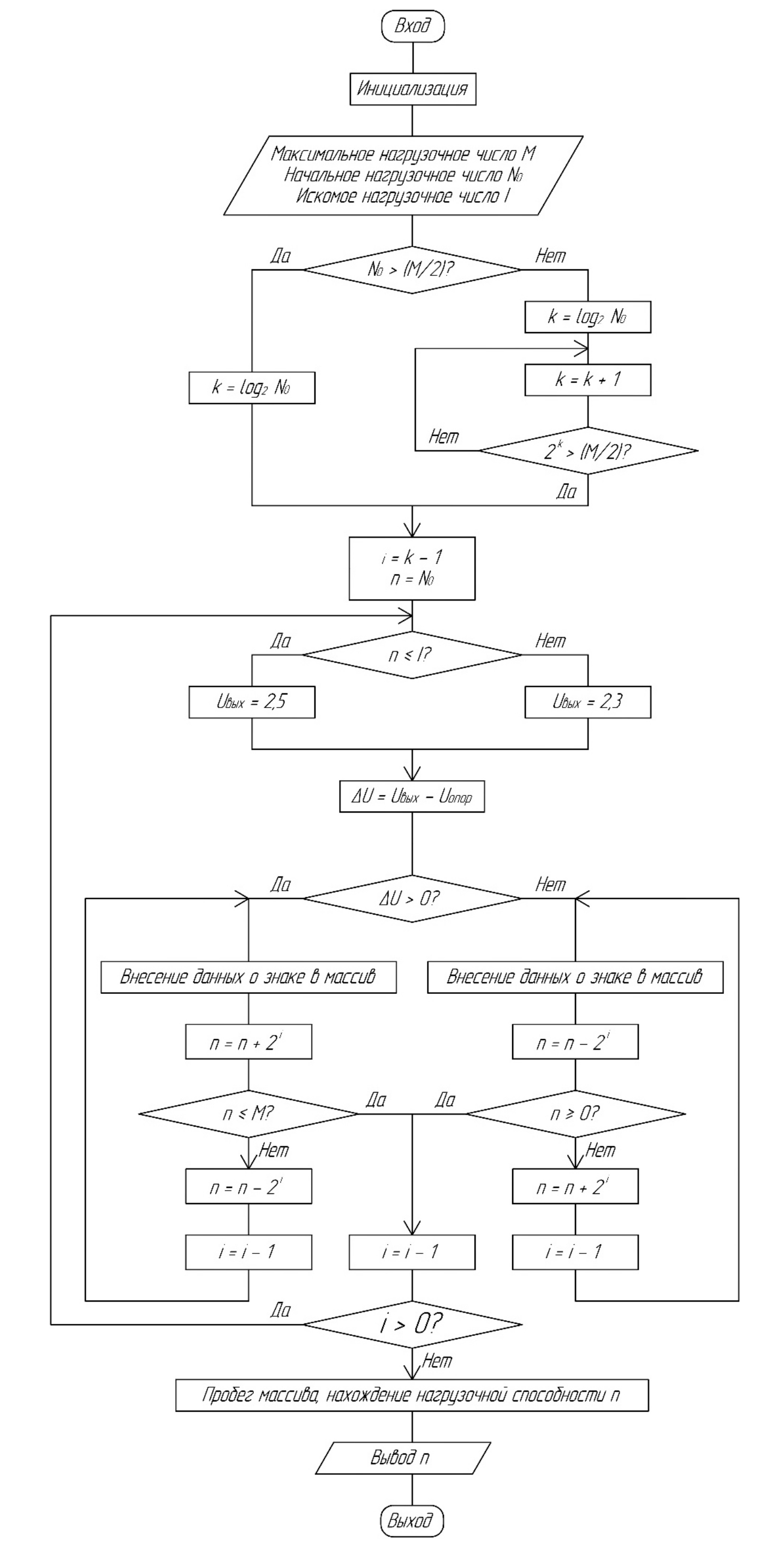 Алгоритм обеспечивает работу устройства контроля в режимах дихотонии, последовательном и ручном. Выполняет функции выбора начального и максимального значения нагрузочных элементов, уровня сигнала, по которому определяется нагрузочная способность.