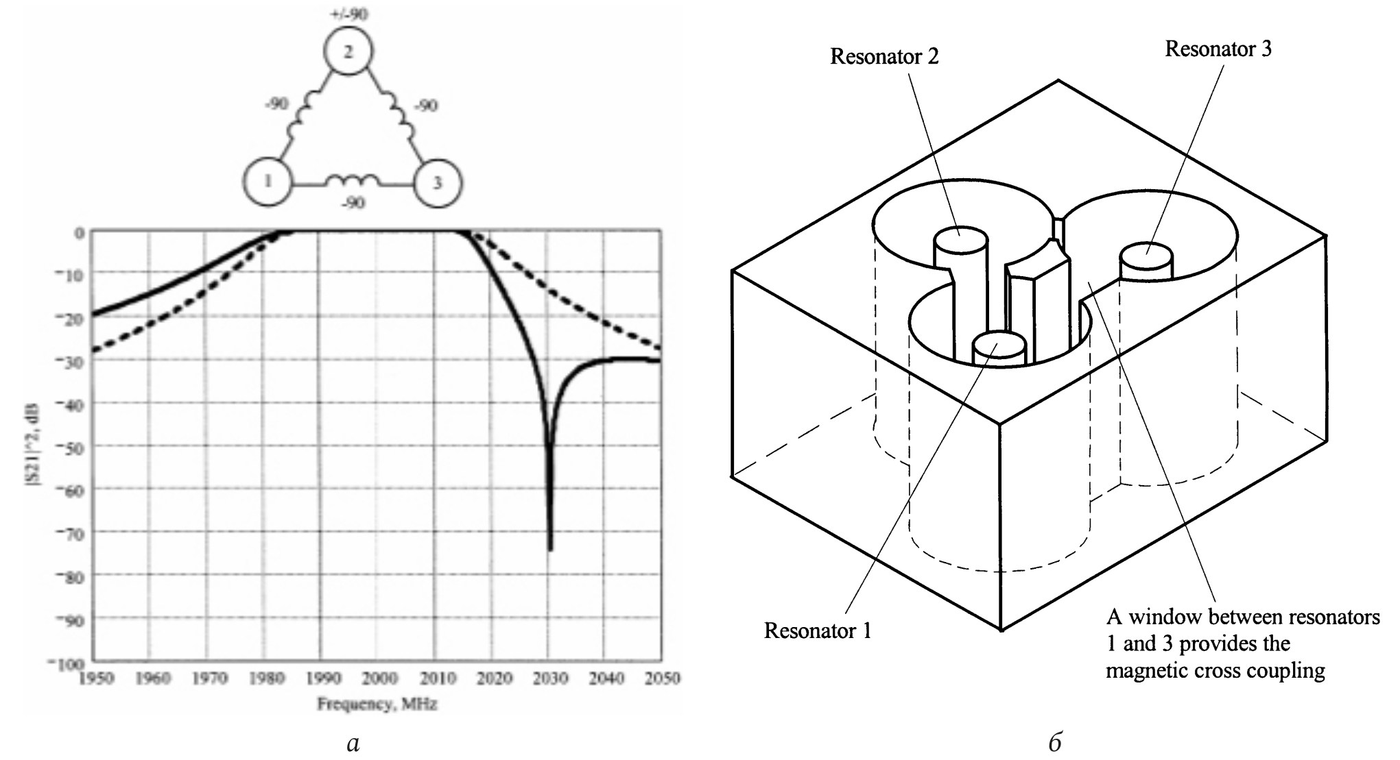 Окно между резонаторами 1 и 3 обеспечивает магнитную перекрестную связь. Ниже резонанса два пути находятся в фазе, а выше резонанса два пути разнесены на 180°. Это выполняется точно только на одной частоте (здесь примерно 2030 МГц), но выполняется приблизительно и для частот около 2020–2040 МГц. Эта деструктивная интерференция вызывает появление нуля передачи на верхнем крае полосы пропускания. Более сильная связь между резонаторами 1 и 3 заставляет нуль двигаться к полосе пропускания. Уменьшение связи перемещает его дальше по верхнему краю. Этот тип перекрестной связи может быть реализован окном между полостями таким же образом, как реализуется первичная связь между резонатором 1 и 2 или между 2 и 3. Достоинство ее заключается в том, что не требуются дополнительные компоненты, рис. 1, б.