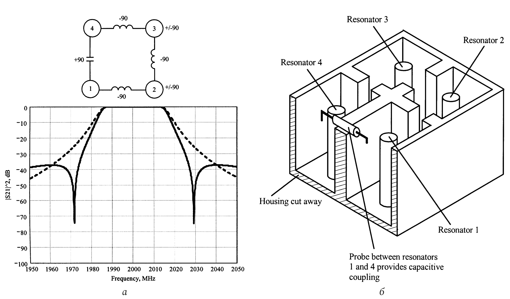 При замене индуктивного элемента между резонаторами 1 и 4 на емкостный зонд получается другой тип каскадно-квадруплетной секции. Эта топология особенно интересна, поскольку нули передачи образуются как выше, так и ниже полосы пропускания (рис. 3). Зонд между резонаторами 1 и 4 обеспечивает емкостную связь.