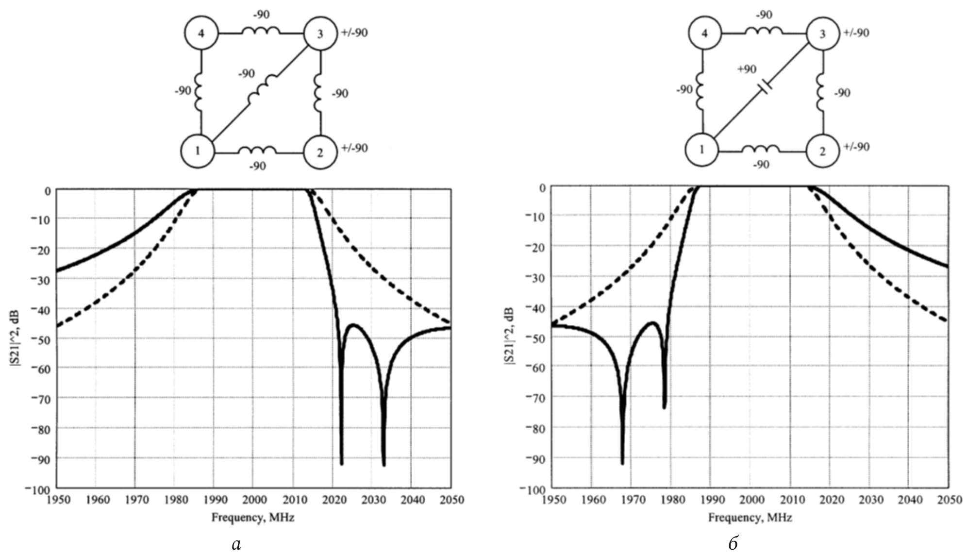 Рис. 4. Вложенная перекрестная связь для получения двух нулей передачи на верхнем (а) и нижнем (б) крае полосы пропускания (сплошная линия)
