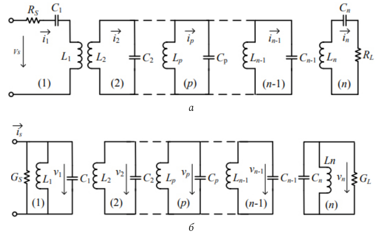 Рис. 7. Эквивалентная схема фильтра из n-связанных резонаторов для метода контурных токов (а) и метода узловых потенциалов (б)
