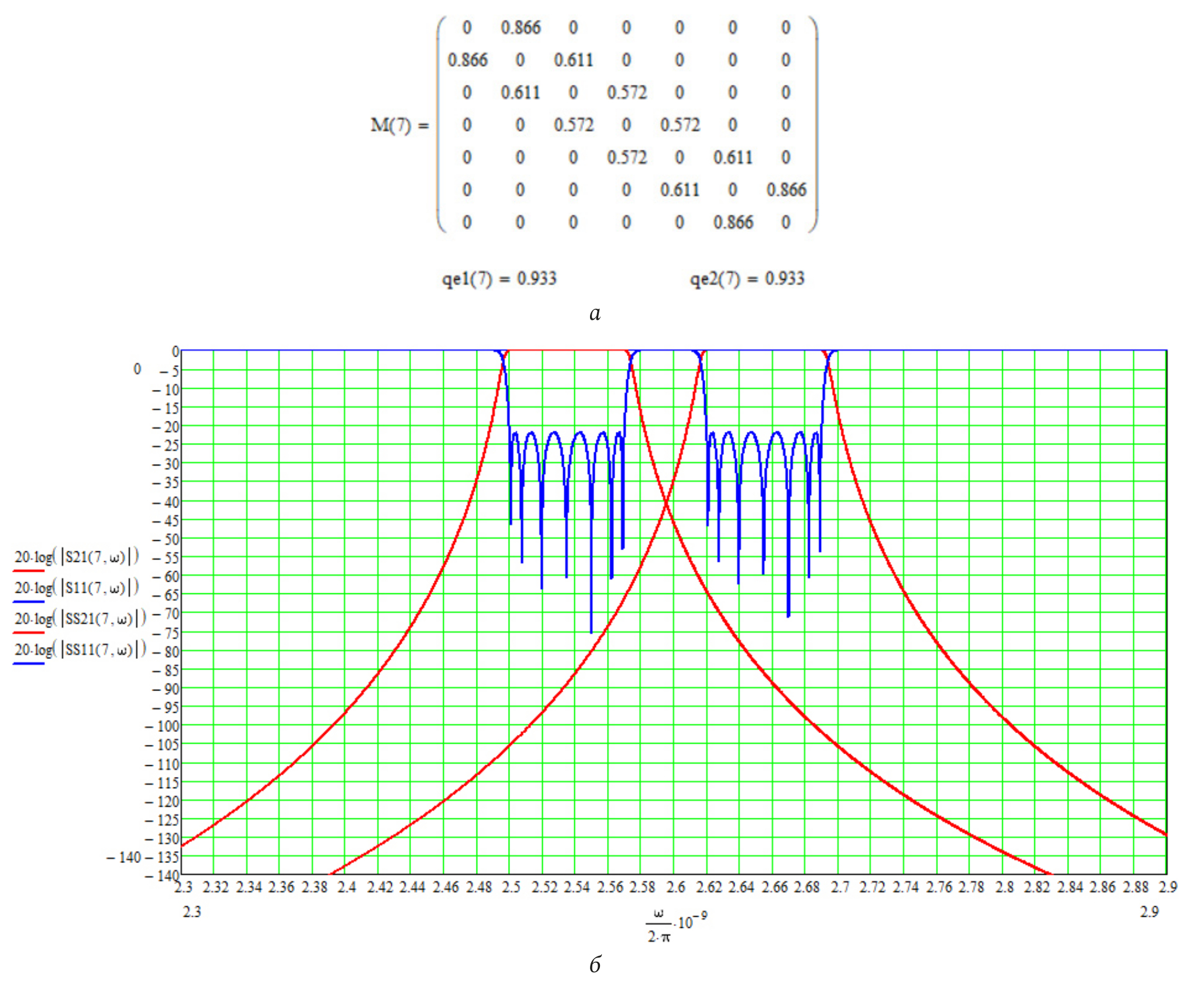 Матрица связи и внешние добротности (нормированные) стандартного фильтра Чебышева седьмого порядка Rх и Tх диапазонов для LR = –22 дБ приведены на рис. 9, а, им соответствуют характеристики, приведенные на рис. 9, б.