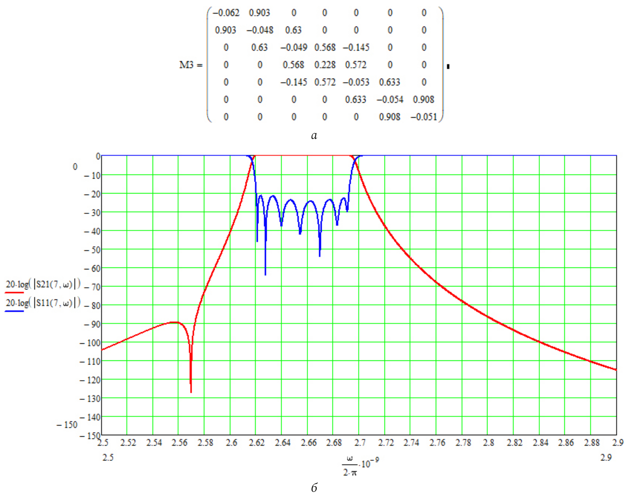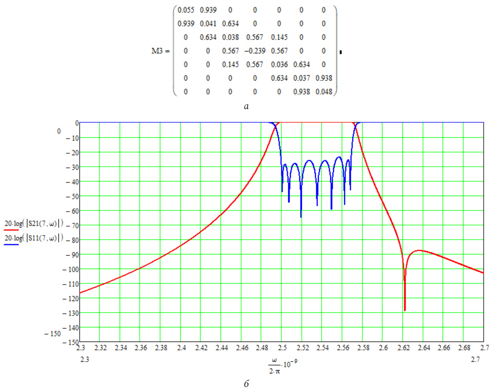 Рис. 10. Матрица связи (а) и характеристики передачи и отражения (б) фильтра Tх 7-го порядка с одной перекрестной связью