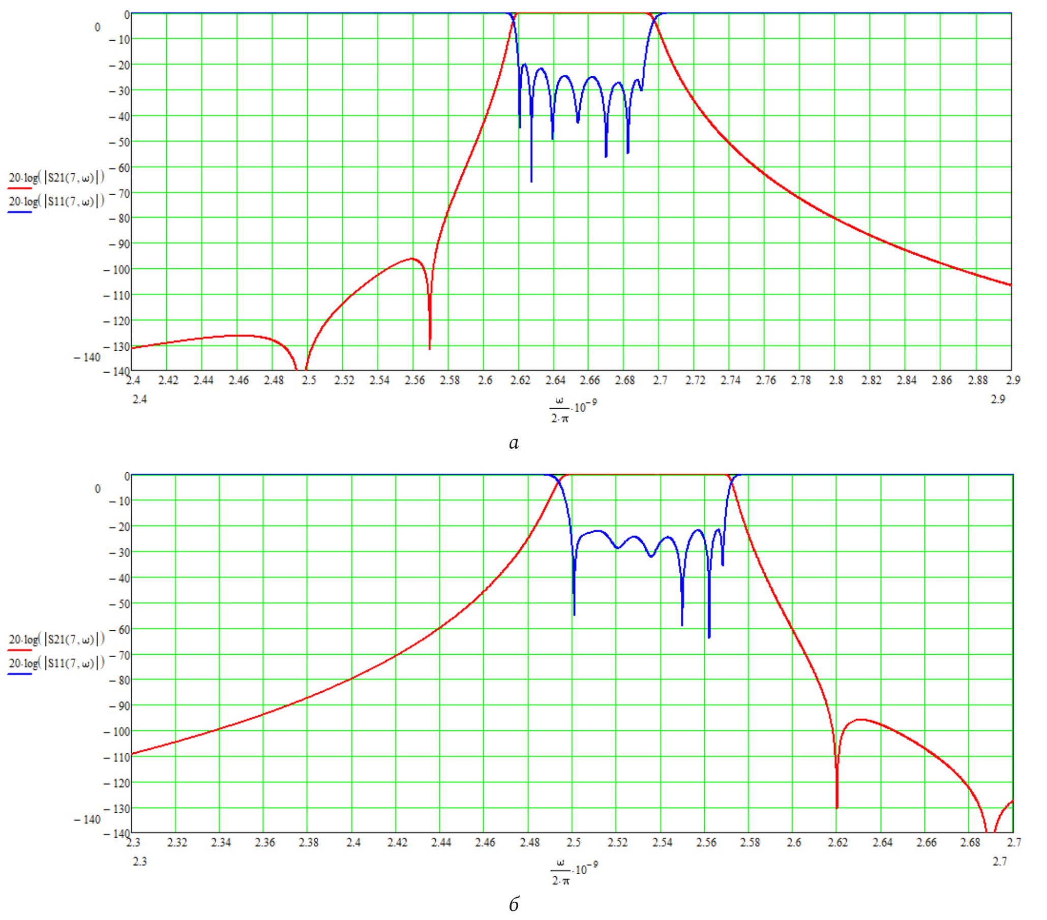 На рис. 12, а и б приведены характеристики фильтров с двумя дополнительными связями между 1-м и 3-м резонаторами и между 3-м и 5-м. В этом случае формируются два нуля передачи в смежной полосе, что позволяет реализовать ослабление –100 дБ в фильтре 7-го порядка.