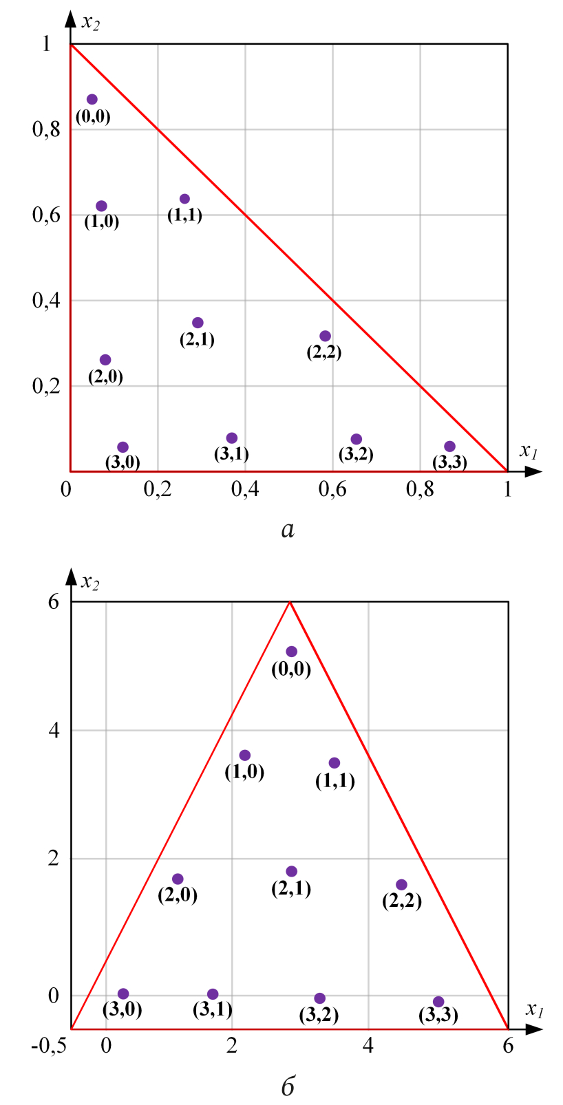 Рис. 5. Корни многочлена Дубинера – Курнвиндера при Нумерация корней отображена в виде где row – номер строки, col – номер столбца: a – на единичном треугольнике; б – на произвольном треугольнике