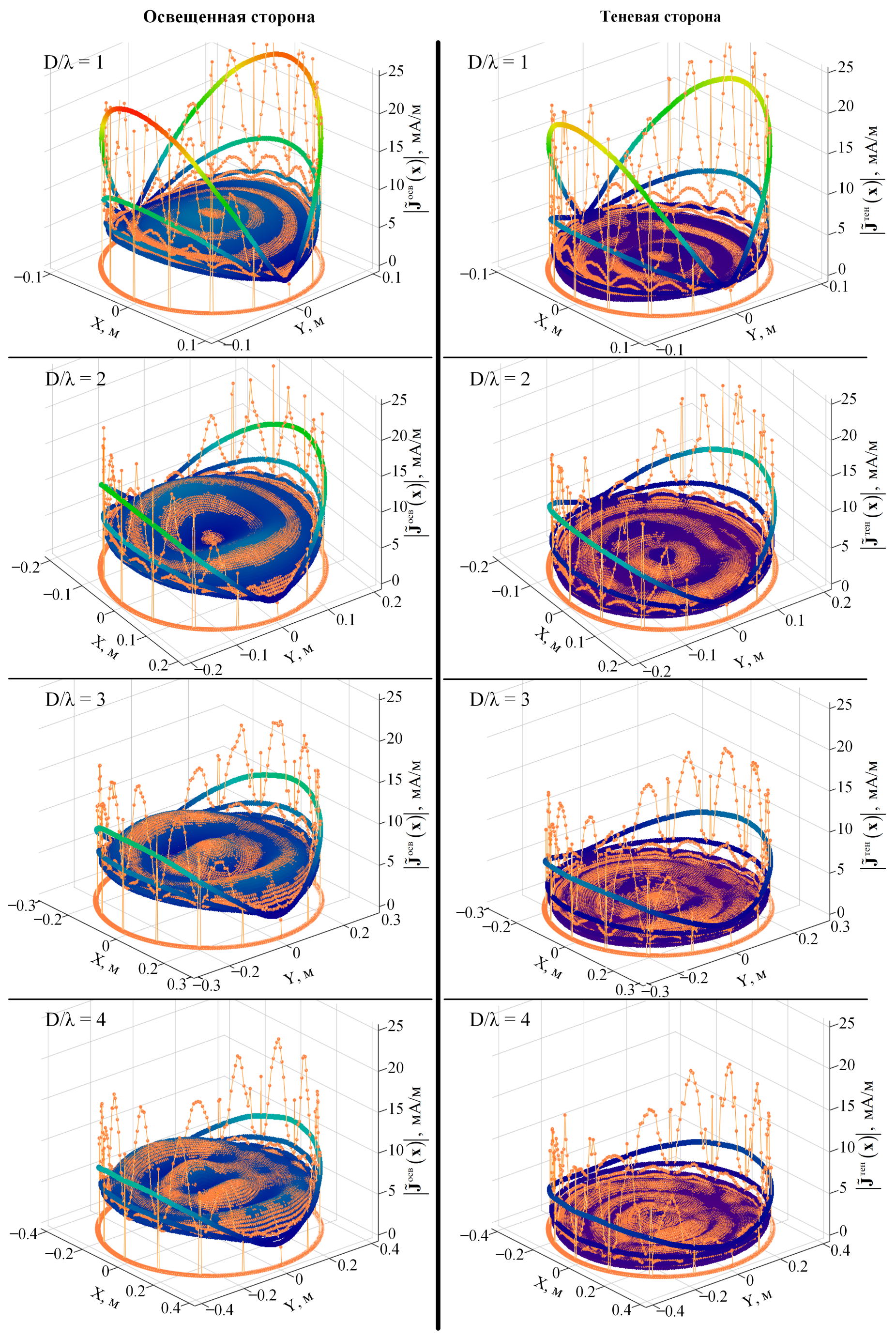 Для наглядной демонстрации предпочтительности сформированного решения выполним серию вычислительных экспериментов, которые предполагают получение плотности тока на освещенной и теневой сторонах диска для различных порядков аппроксимации полиномов и размеров диска, заданного соотношением , – длина волны.