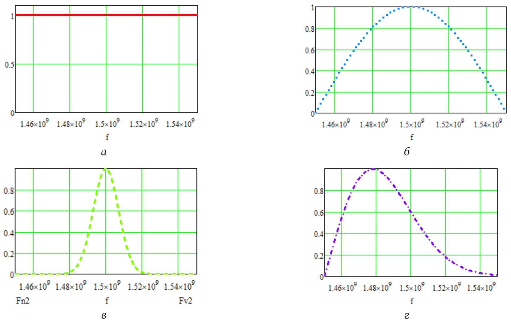 Рис. 1. Виды спектров излучаемых сигналов диапазона 100 МГц: а – равномерный; б – спадающий; в – нормальный; г – релеевский