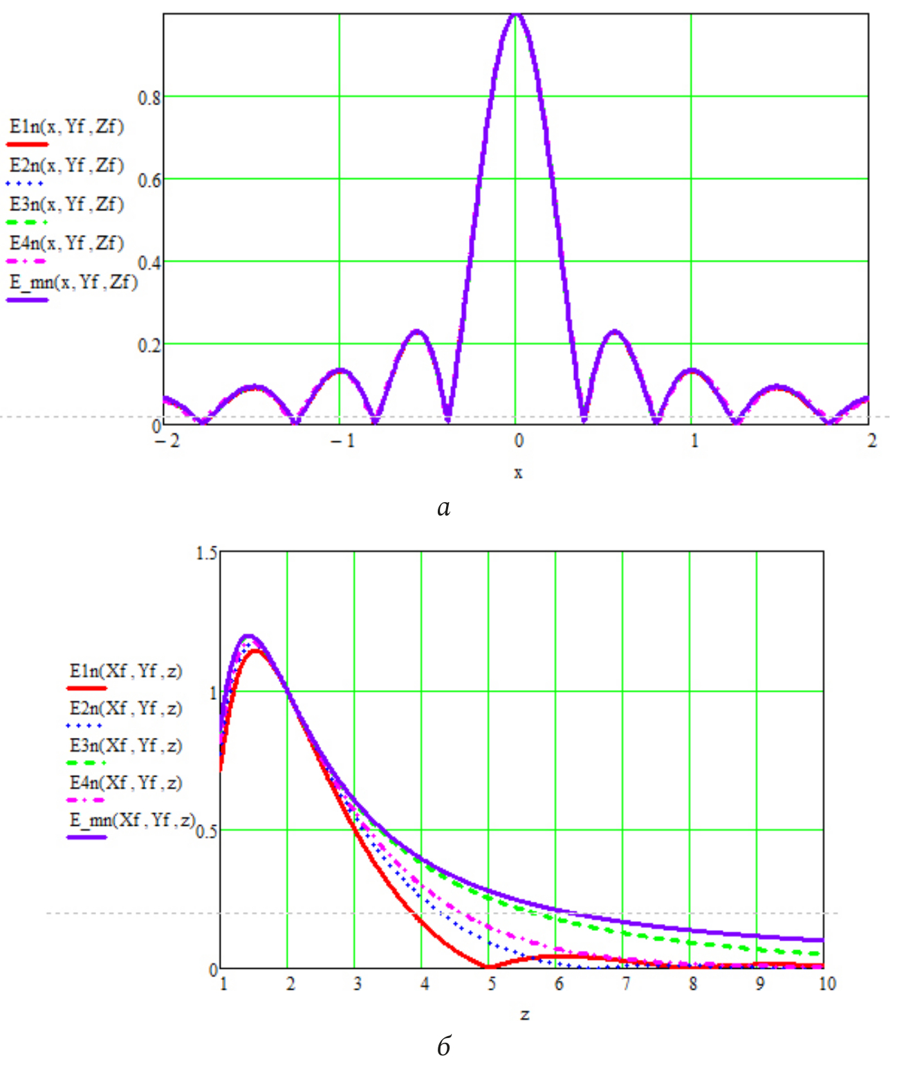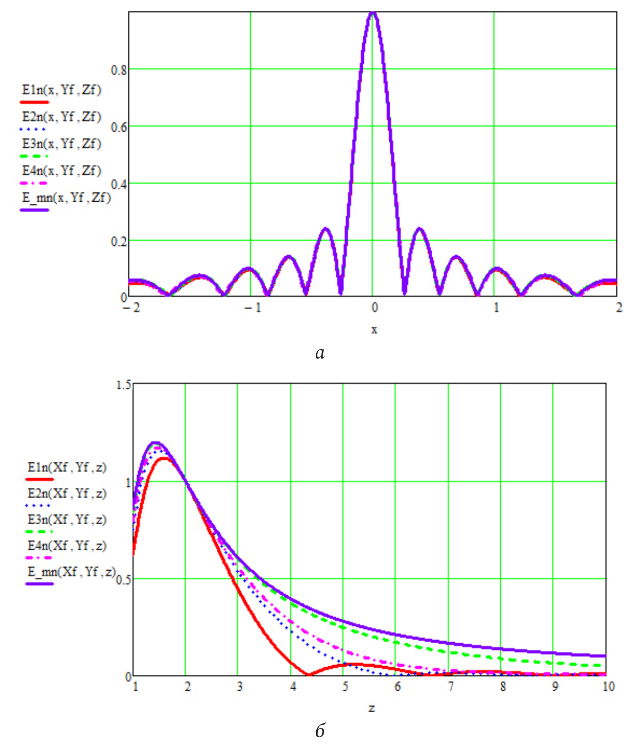 Факт смещения максимума модуля напряженности сфокусированного электрического поля можно объяснить тем, что для сфокусированной дискретной антенны модуль напряженности поля, описываемого выражением (2), по мере приближения от точки фокусировки к сфокусированной дискретной антенне убывает медленнее из-за все более несинфазного сложения каждой частотной компоненты спектра, чем возрастает из-за уменьшения расстояния до точки реального максимума. Данный эффект практически не проявляется для разреженных сфокусированных дискретных антенн. Проиллюстрируем это графиками на рис. 4. Для этого рассмотрим линейную дискретную сфокусированную антенну со следующими параметрами: