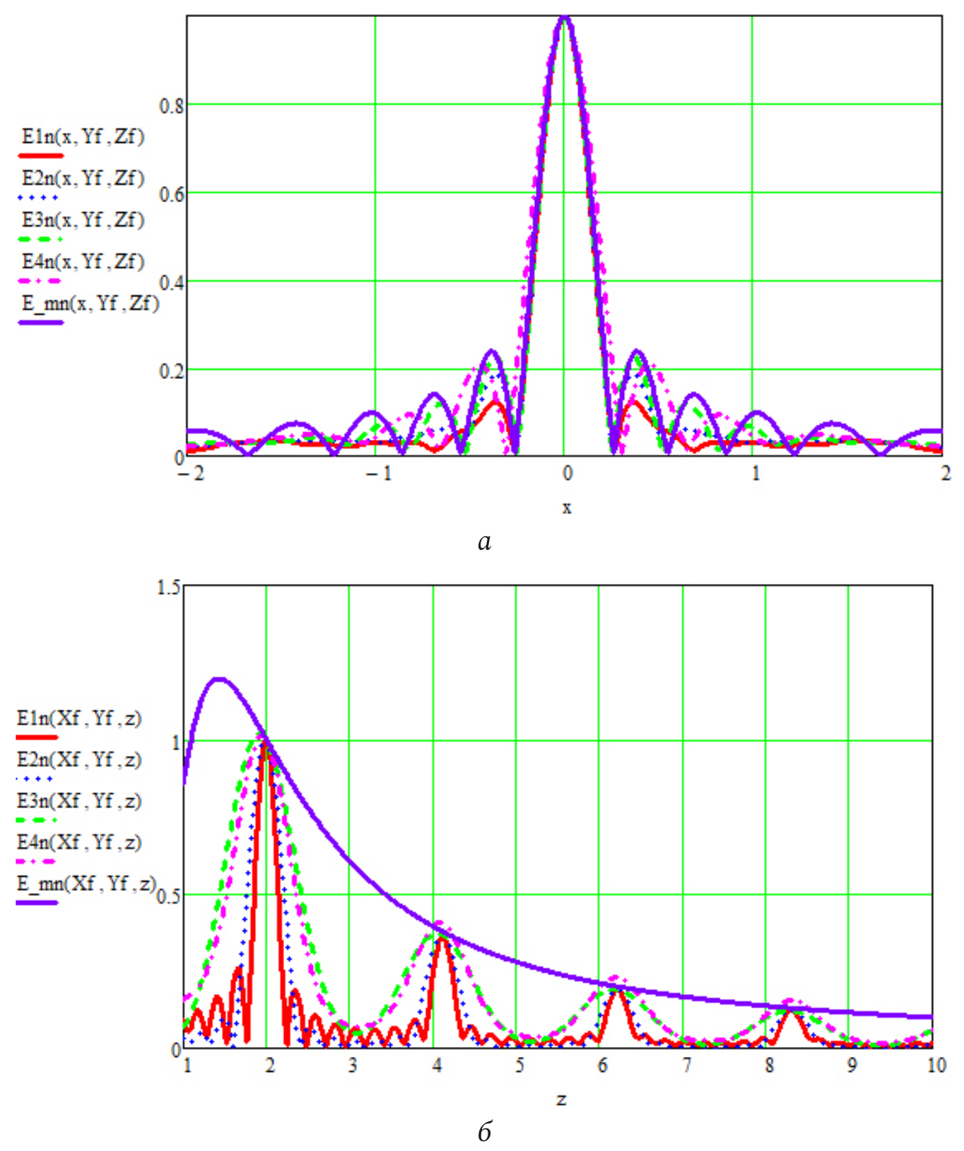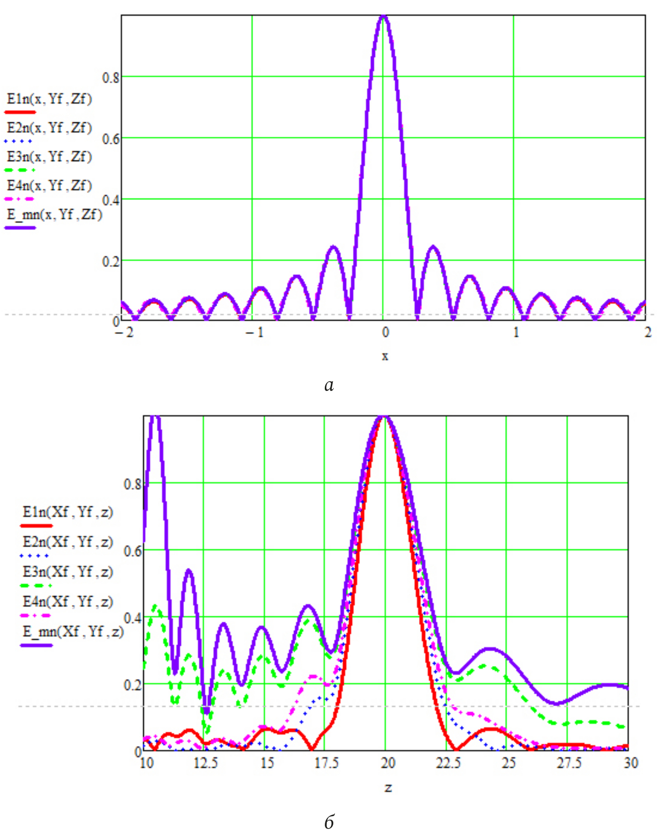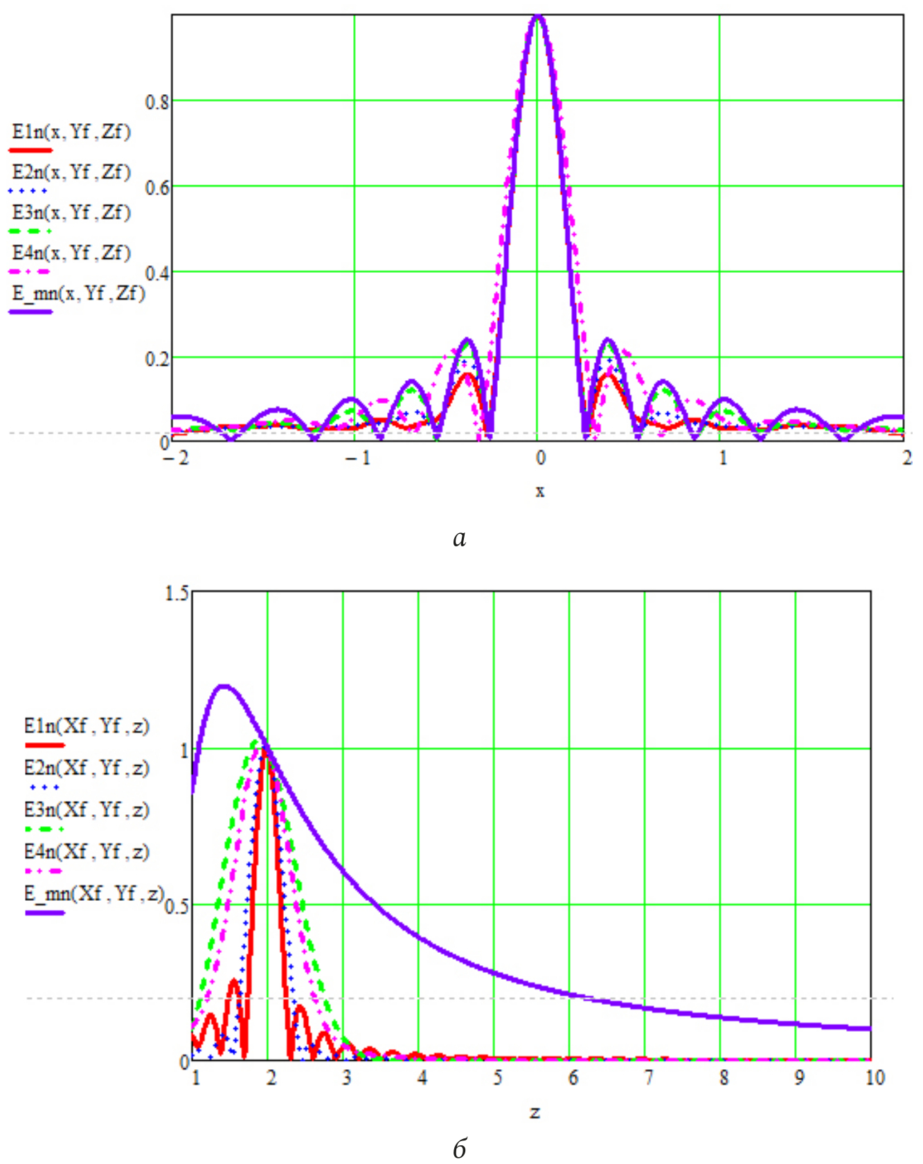 Рис. 2. Нормированные распределения модуля напряженности поля широкополосной сфокусированной дискретной антенны c Δf=100 МГц в направлении: а – поперечном; б – продольном