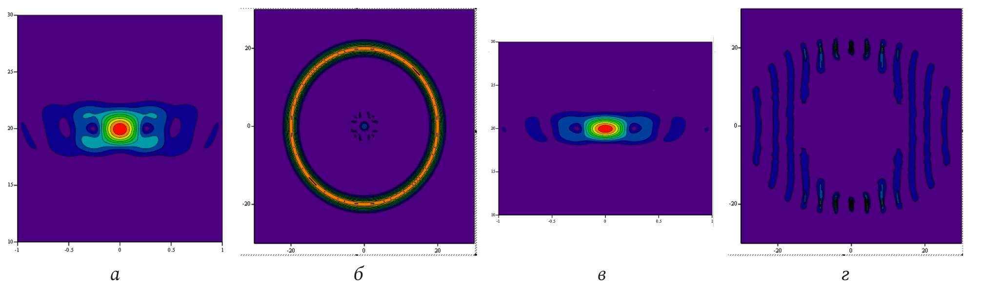 Fig. 5. Spatial distributions of the modulus of the broadband focused field strength of a linear discrete antenna: a – in the horizontal plane (the Z axis is directed upward); b – in the vertical plane (the linear antenna lies in the center of the circle), of a flat discrete antenna; c – in the horizontal plane (the Z axis is directed upward); d – in the vertical plane passing through the focal point