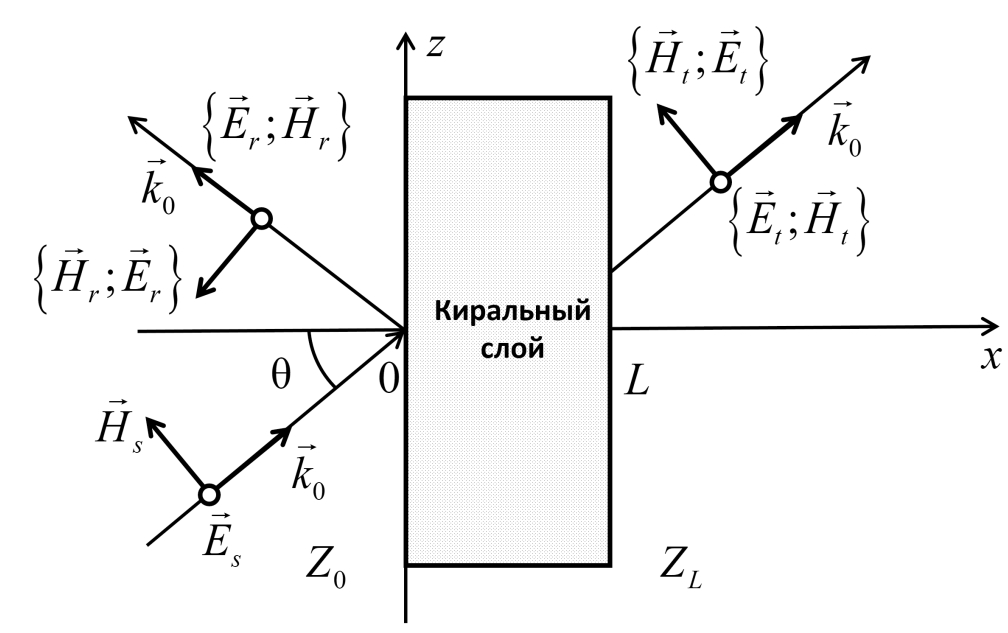 С помощью материальных уравнений в форме (1) и уравнений Максвелла в дифференциальной форме будем решать задачу об отражении плоской однородной электромагнитной волны от неоднородного невзаимного кирального слоя с учетом дисперсии. Волна падает на границы раздела под углом θ (рис.). На рис. введены следующие обозначения: – векторы напряженностей электрического и магнитного полей падающей волны; – векторы отраженной волны и – векторы прошедшей волны.
