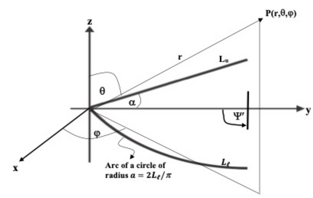 As observed in [9; 25], the introduction of geometrical asymmetry in the curvilinear dipole antenna’s structure has significant effects on the antenna’s performance. This influence is not well-captured in the treatment of the concave Nu dipole presented in [18], mainly because only one value of slant angle was considered in that publication. Arelationship between relative arms’ lengths and slant angle may be conveniently established by projecting both arms on the y-axis. The projection of the upper arm (of length Lu) of the concave Nu dipole on the y-axis is When it is noted that the lower arm is a quarter of a circle (of radius a) in extent, and letting Ll represent the physical length of this arm, it becomes easy to see that Hence, both arms will have equal projections on the y-axis, when