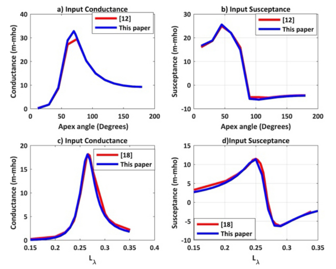 The profiles of Fig. 3, a, b compare the input admittance data of the VDA with dimensions given in Table 2 of [12], with computational results for the same VDA, obtained with this paper’s formulation. Also, the input admittance comparisons of Fig. 3, c, d, are for the concave Nu dipole treated in [18, Fig. 2] and corresponding computational data due to this paper. The very close agreements between these profiles lend credence to the validity of the formulation in this paper.