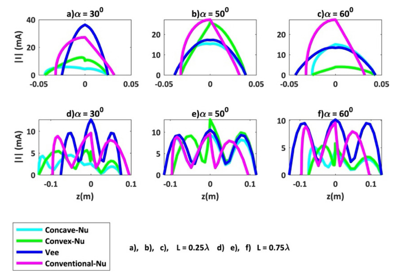 From the curves displayed in first row of Fig. 4, it can be seen that when the half-arm length is limited to for all the curvilinear structures, magnitude of current varies significantly with apex angle When changes from to for example, magnitude of current for the V-dipole became generally halved in size. Furthermore magnitude of current for the convex-Nu dipole increased significantly, generally becoming larger than corresponding values for the V-dipole. At values of magnitude of current recorded for the convex-Nu drastically reduced from those recorded at Profiles of magnitude of current displayed in Fig. 5, d, e, f, for the cases are generally comparable for all the curvilinear configurations, for For the other two values of apex angle, values recorded for the concave-Nu and convex-Nu structures are noticeably smaller.