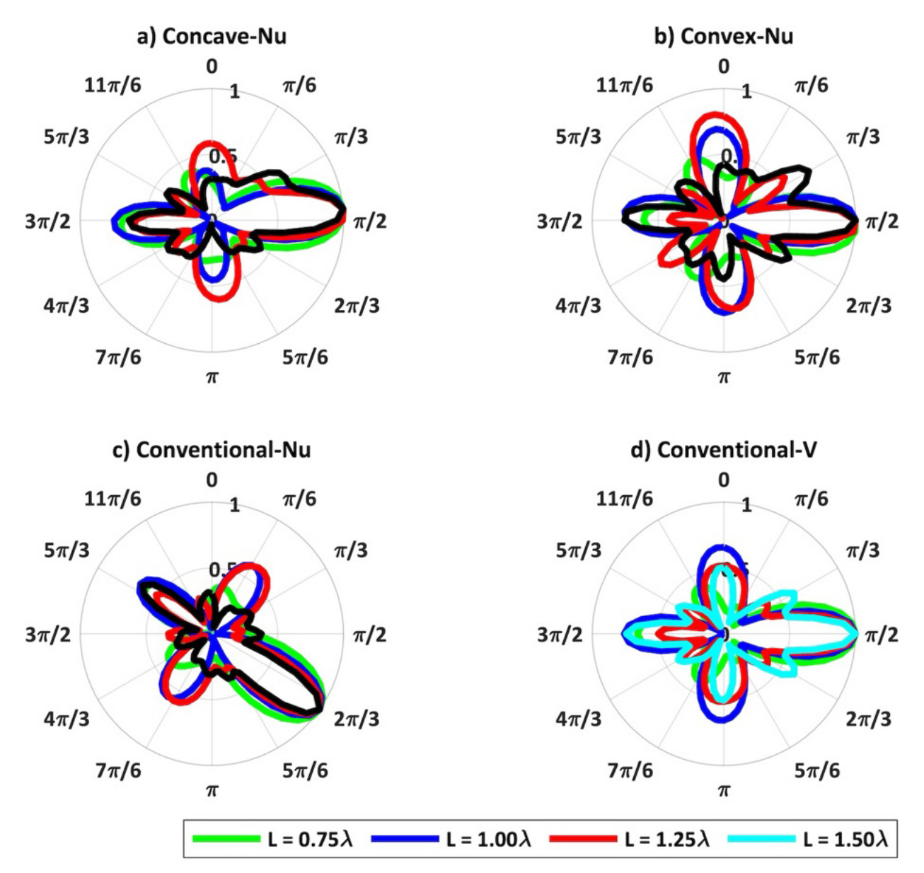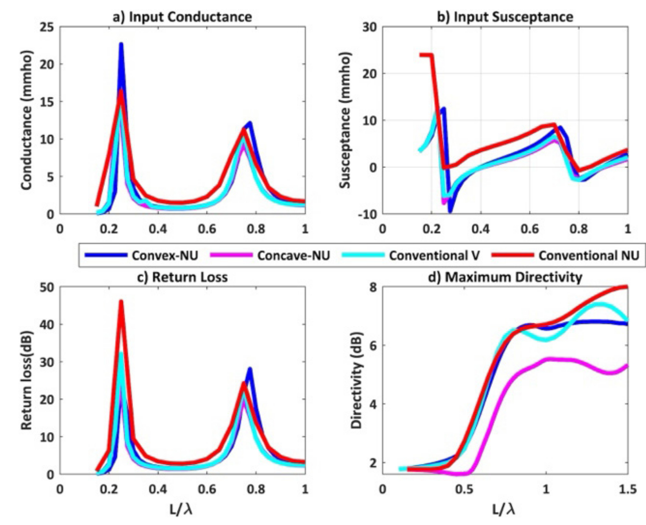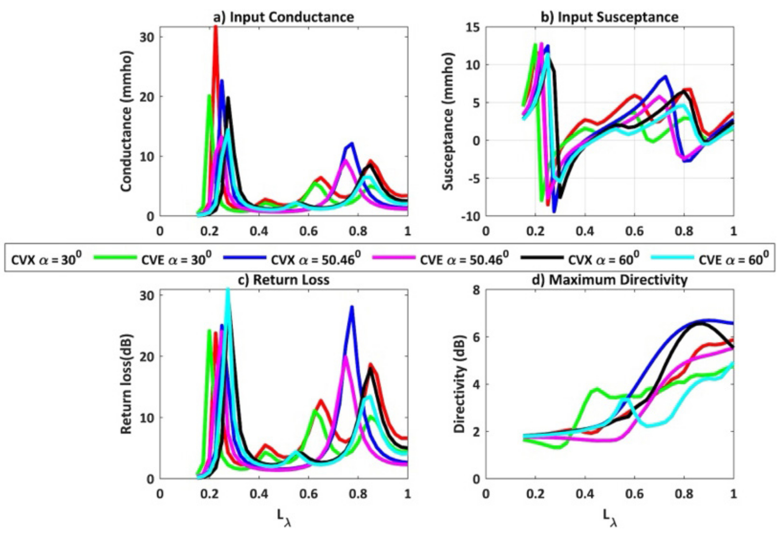Variations of return loss with arms’ lengths for different values of apex angle, are displayed in Fig. 6, c. The profiles clearly fall into the two categories earlier described for Return loss for the first set reveal that maxima,of the configurations had the largest values (with that for the concave-Nu slightly greater),whereas, values recorded by the other four configurations featured marginal differences. For the second set, the convex-Nu and concave-Nu configurations recorded the distinctly largest and least values of return loss, respectively. Finally, it can be seen from the maximum directivity profiles of Fig. 6, d, that values for the convex-Nu configurations are significantly larger than those of the concave-Nu configurations.