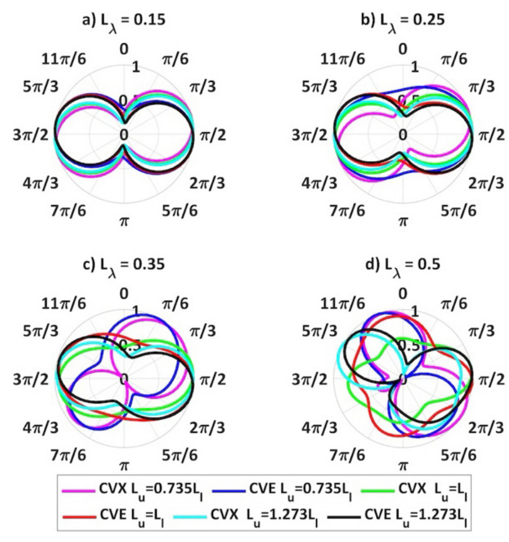 A number of interesting features are revealed by the far-field patterns in the antenna plane, displayed in Fig. 7. For normalized upper length arm of 0,15, the field pattern profiles of Fig. 7, a, share similar shapes (referred to in [24] as ‘azimuth’, and similar to Fig. 2 of [18]) for all values of slant angle. From Fig. 7, b, for it can be seen that the symmetry displayed in Fig. 7, a, no longer features in all cases. As a matter of fact, in this case, the pattern due to the concave-Nu with assumes a form that may be described as ‘quasi-omnidirectional’. In addition to the ‘rotation of orientation’ described in [18], the patterns of Fig. 7, c, include another ‘quasi-omnidirectional’ pattern, this time, due to the convex-Nu with configuration.