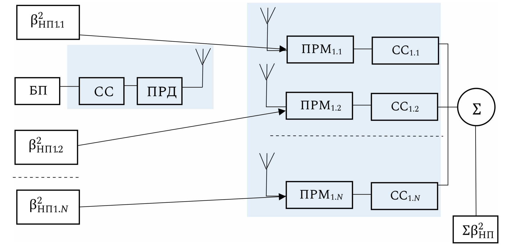 Другим способом решения рассматриваемой проблемы может быть применение дополнительных наземных пунктов управления для повышения уровня отношения сигнал/шум суммарного сигнала. Его сущность заключается в увеличении числа недорогих по стоимости и связанных между собой в единую сеть наземных пунктов управления с изотропными антеннами с низким коэффициентом усиления с возможностью приема данных от беспилотных платформ. По сути, такая распределенная в пространстве система представляет собой разнесенную антенную решетку, элементами которой являются антенны приемных пунктов. Структурная схема предлагаемого решения показана на рис. 1. Необходимо отметить, для реализации данного варианта необходимо, чтобы все пункты имели единую непрерывную зону радиовидимости. Из рис. 1 видно, что дополняется и .
