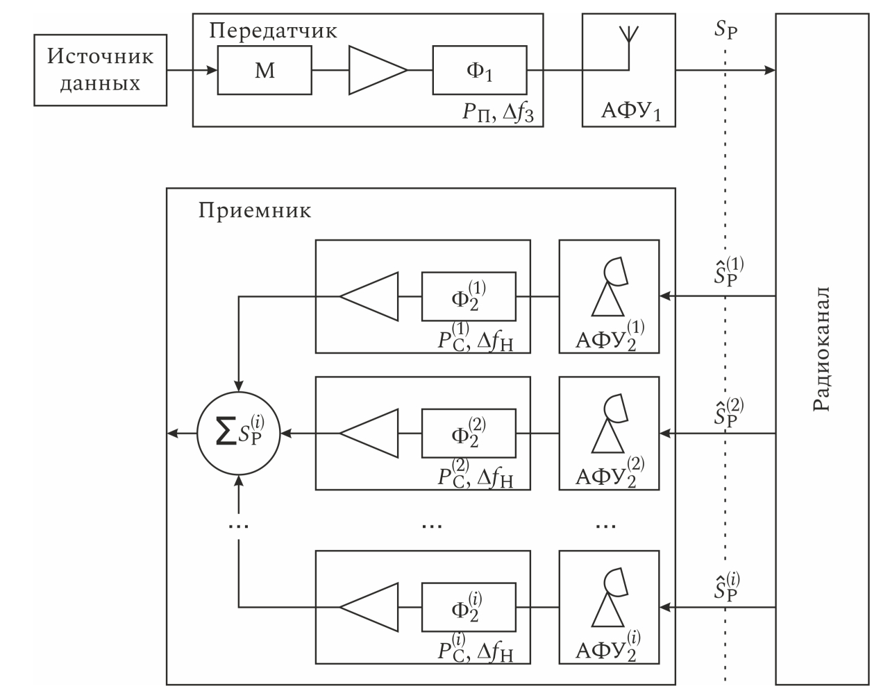 Фильтры приемников осуществляют фильтрацию принимаемого радиосигнала в необходимой полосе частот и определяют мощность шума а также отношение сигнал/шум по мощности в необходимой полосе частот.