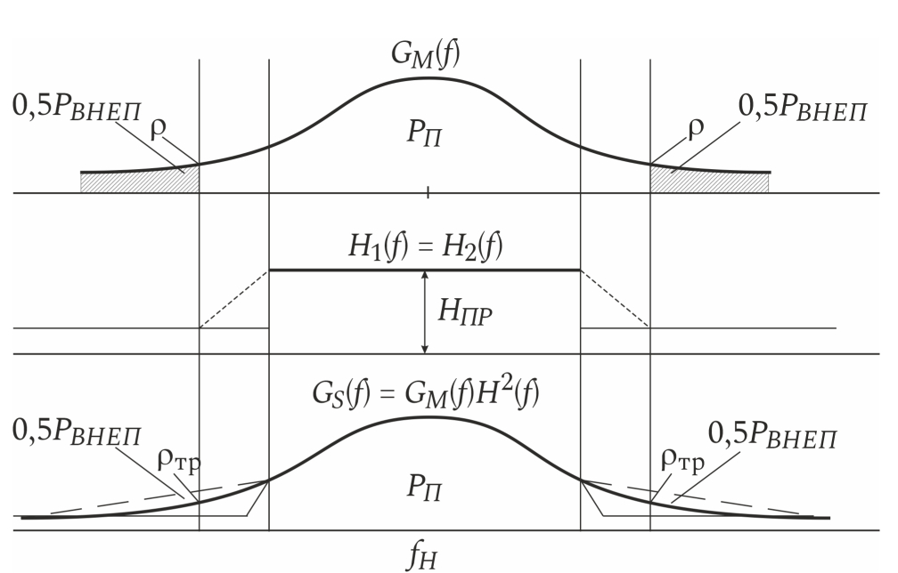 В линейном тракте приемника происходит усиление с коэффициентом принимаемого сигнала и перенос его спектра на промежуточную частоту [9]. Обычно АЧХ фильтров и одинаковы, поэтому суммарный сигнал на входе демодулятора ДМ имеет энергетический спектр (рис. 7), совпадающий по форме в необходимой полосе частот с энергетическим спектром сигнала на выходе модулятора.