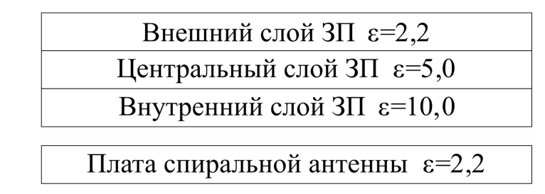В целях повышения серийнопригодности и технологичности конструкции, а также сохранения конформных свойств антенны целесообразно использовать для создания планарных ЗП высокочастотные материалы, применяемые для изготовления печатных плат. В этом случае ЗП представляет собой композицию из нескольких слоев диэлектрических подложек с разной диэлектрической проницаемостью, расположенных по мере ее убывания. Подложка с большей диэлектрической проницаемостью прилегает к излучающему элементу, подложка с наименьшей диэлектрической проницаемостью контактирует с внешней средой.