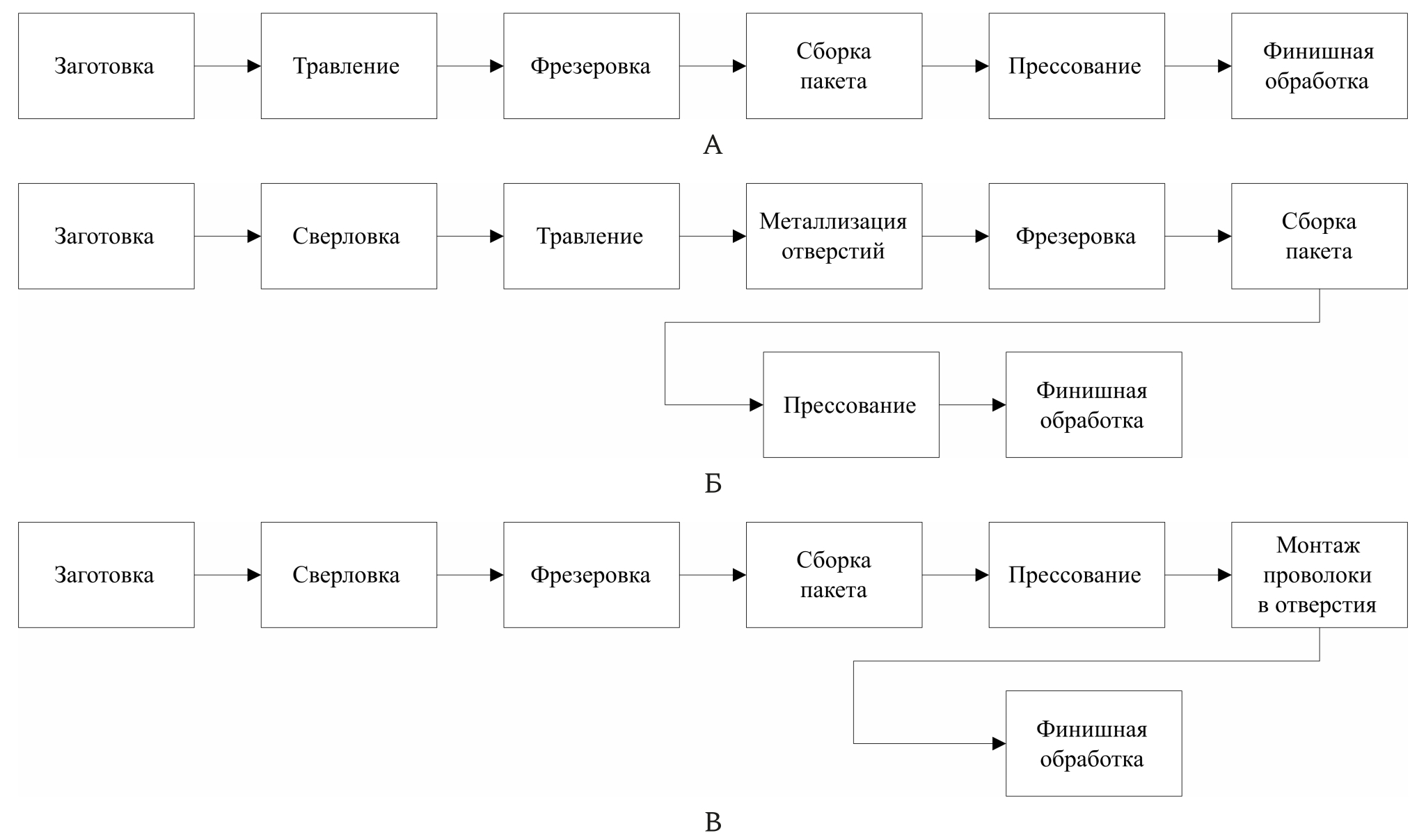 Рис. 3. Блок-схемы технологических процессов изготовления ЗП (А – диэлектрические пластины для Образца II; Б – диэлектрические пластины с металлизированными отверстиями для Образца III; В – диэлектрические пластины с заполненными отверстиями для образца IV)
