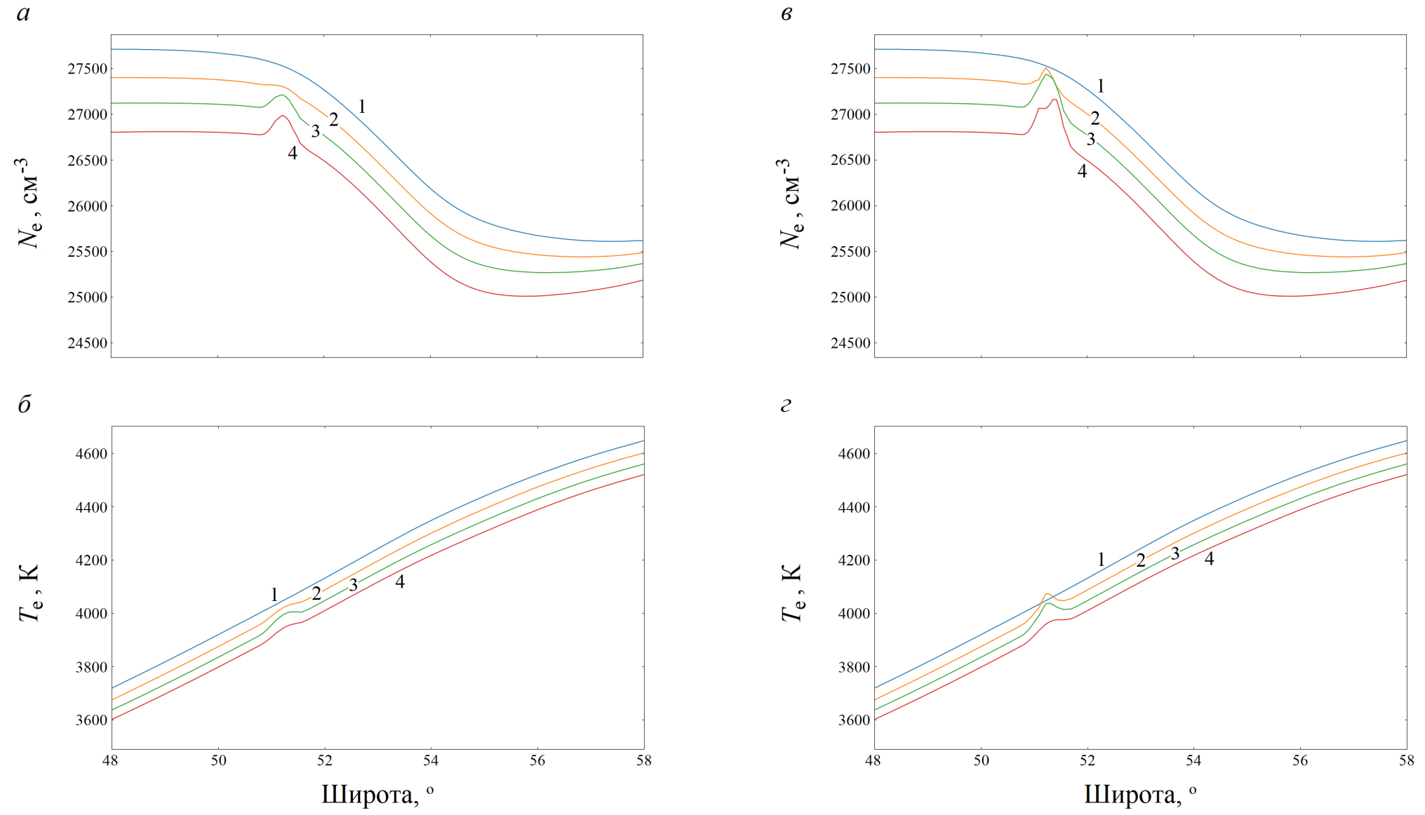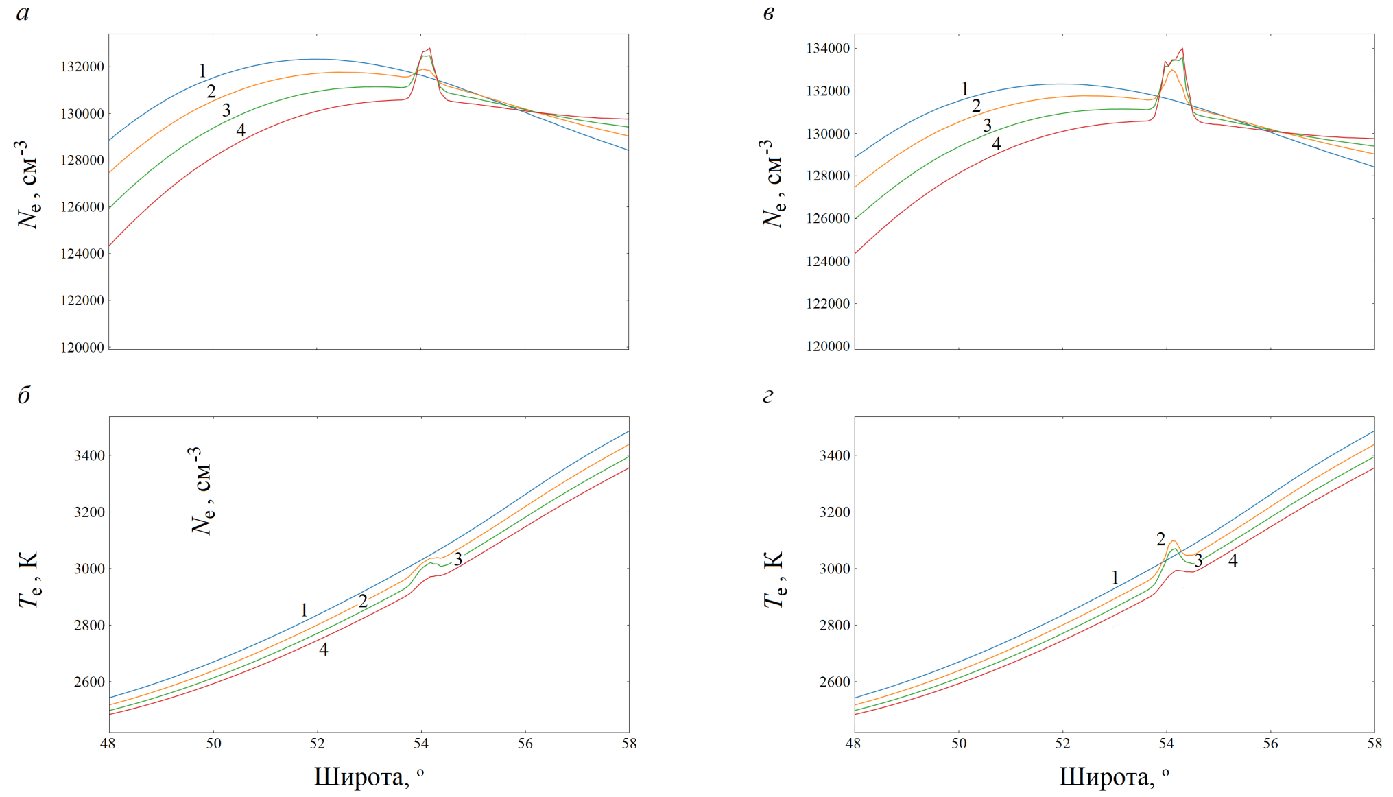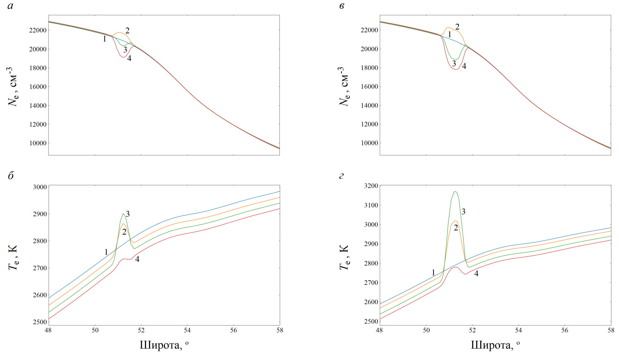 Рис. 3. Широтные профили распределений плотности (а и в) и температуры электронов (б и г) на h=700 км для следующих моментов времени: 18:00:00 UT (1), 18:10:00 UT (2), 18:20:00 UT (3) и 18:30:00 UT (4)