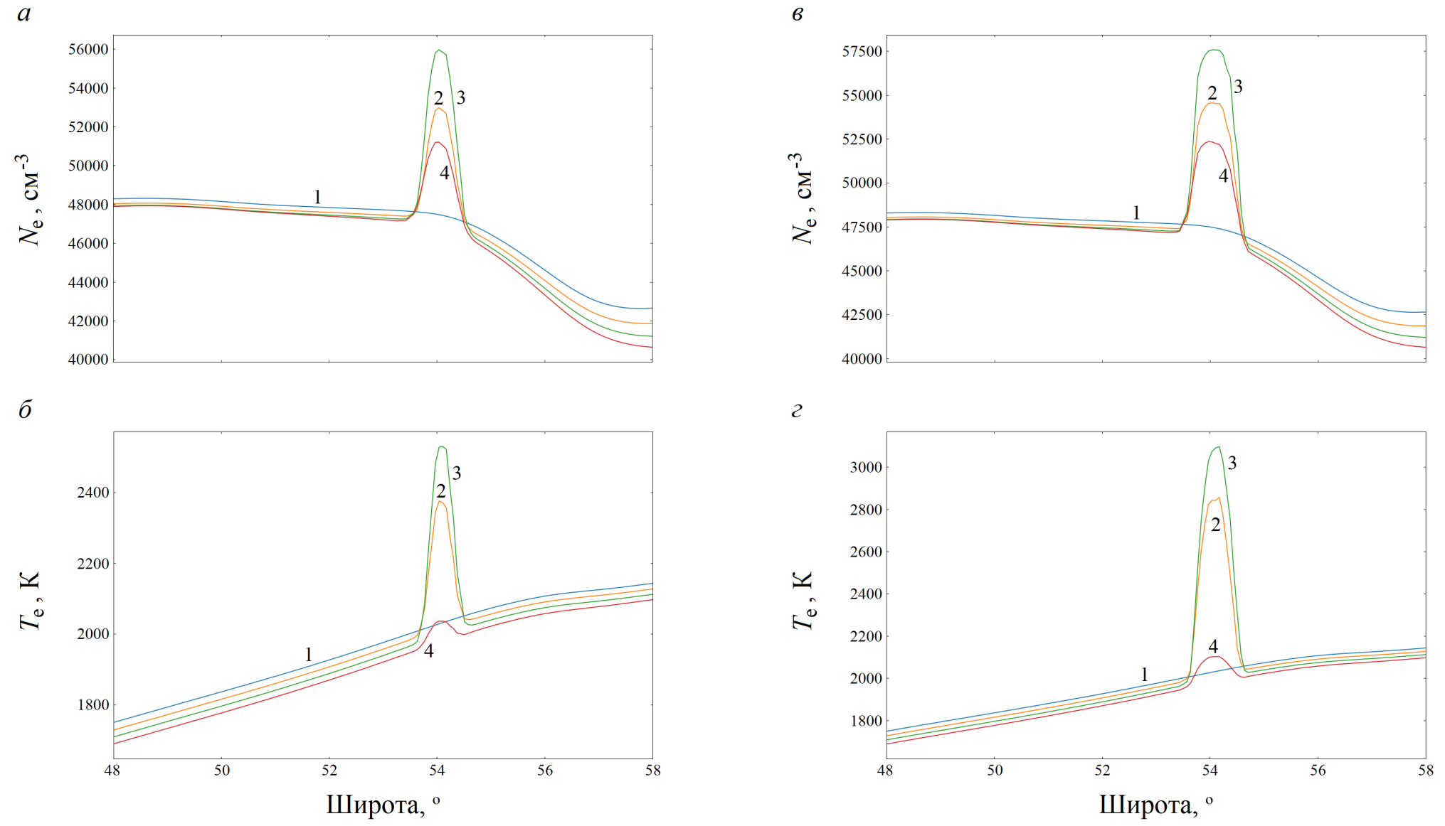 На рис. 3 и 4 представлены полученные при моделировании распределения плотности и температуры электронов для различных моментов времени (кривая (1) – непосредственно перед включением источника нагрева 18:00:00 UT, кривая (2) – 18:10:00 UT, кривая (3) – выключения нагрева 18:20:00 UT, кривая (4) – спустя 10 мин после выключения источника нагрева 18:30:00 UT) во внешней ионосфере Земли на высотах 700 и 1500 км. В левом столбце рис. 3 и 4, а и б представлены результаты моделирования для действующих параметров нагрева, а в правом столбце (в и г) – для параметров после проведения модернизации стенда, аналогично как и для рис. 1 и 2.