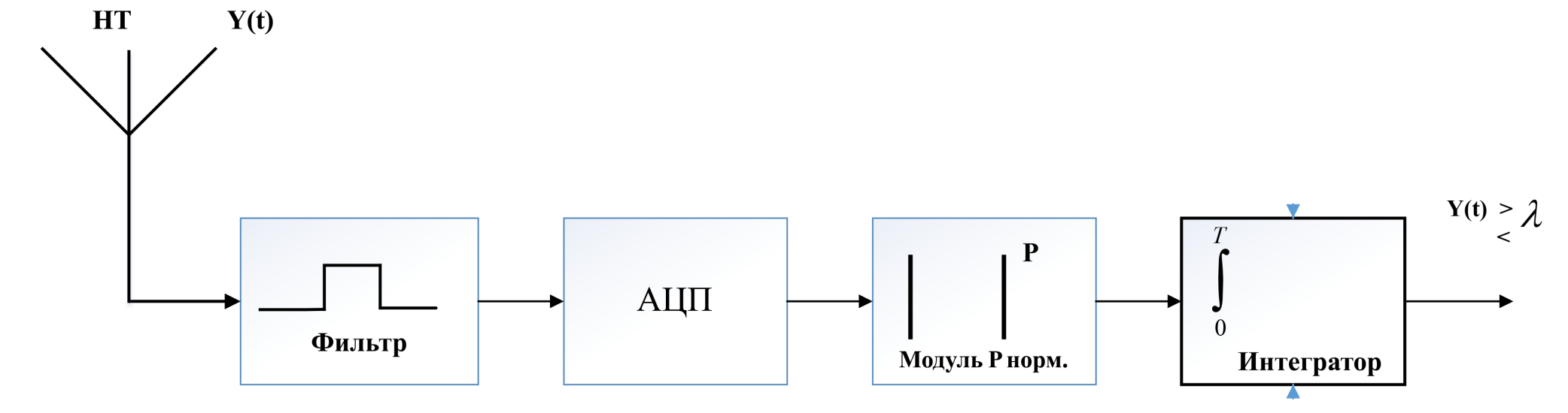 Решение выносится сравнением Y(T) – выходного сигнала усовершенствованного детектора энергии (УЭД) – с пороговым значением схемы решения λ. Улучшенный или усовершенствованный детектор энергии (Improved Energy Detector), используемый при зондировании спектра в сетях когнитивного радио, получается из схемы обычного энергетического детектора модификацией последнего путем замены операции возведения в квадрат амплитуды принимаемого сигнала в обычном ЭД на произвольную положительную степень p.